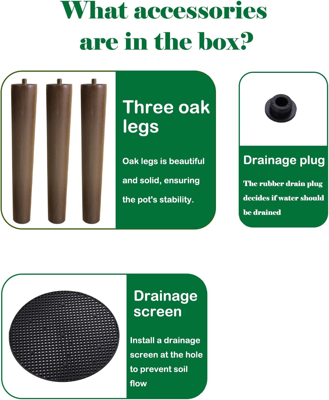 - planter With Legs: Three quality oak legs are very easy to install, just screw the wooden legs into the hole, no tools required to complete. The triangular structure is more stable and can withstand up to 100 pounds of weight.