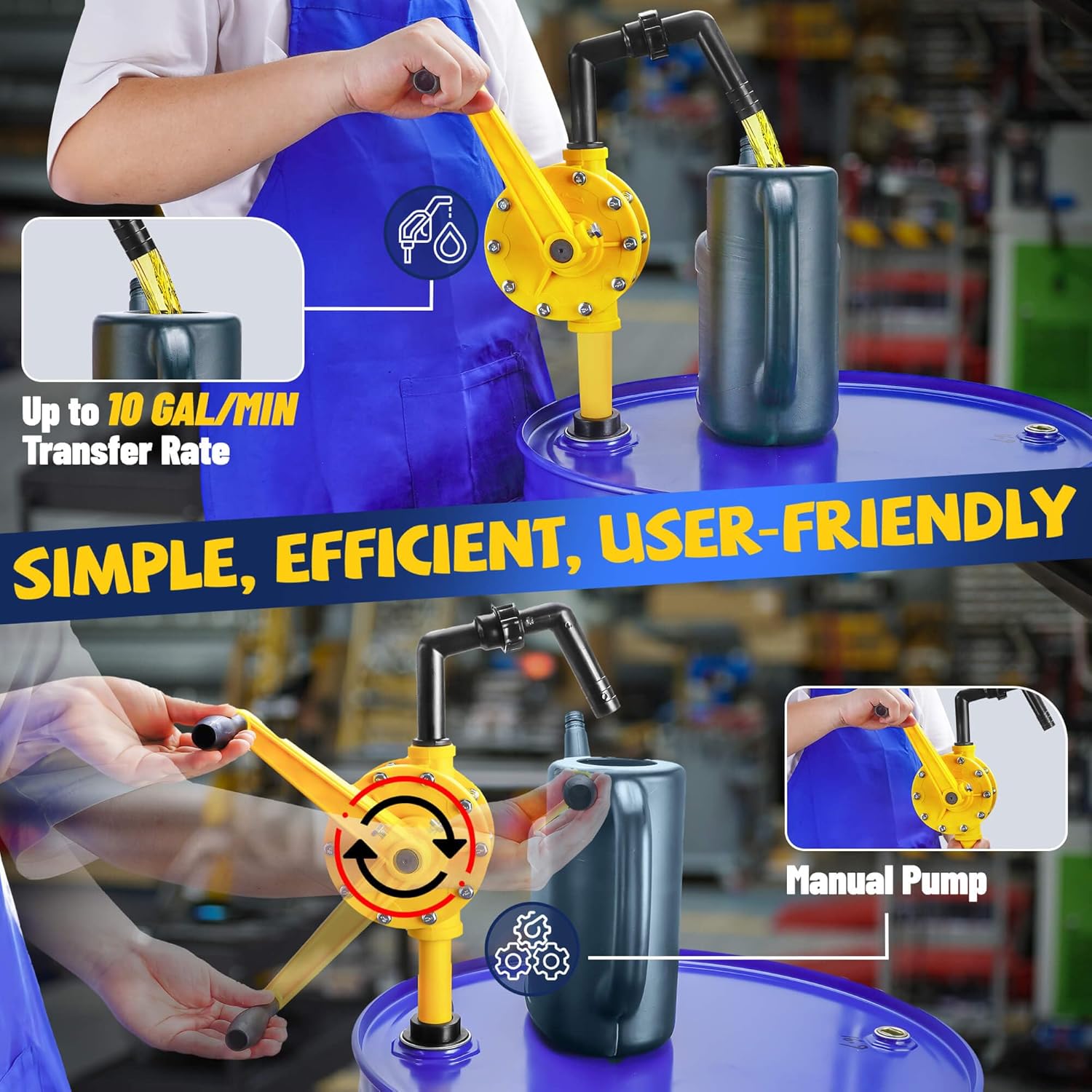 15-55 Gallon Drum Pump, 10 GPM Flow, Corrosion-resistant Chemical Liquid Pump, Hand-operated rotary barrel pump designed for rapid transfer of water, fuel, corrosive liquids and more