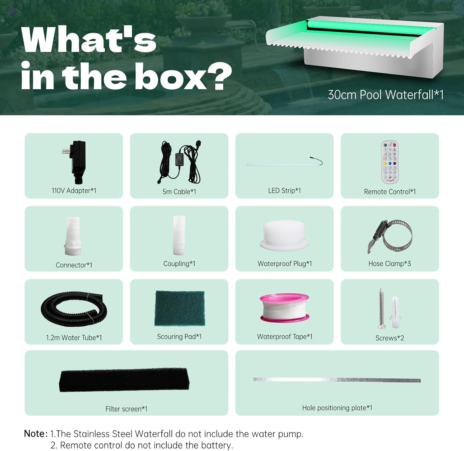 - 【Decoration Waterfall】Weejian waterfall spillway will make a decorative addition to your garden patio pond or swimming pool, it makes them more elegant, fashionable and beautiful. The color change of LED lights and the gentle sound of water running make your patio more special at night.