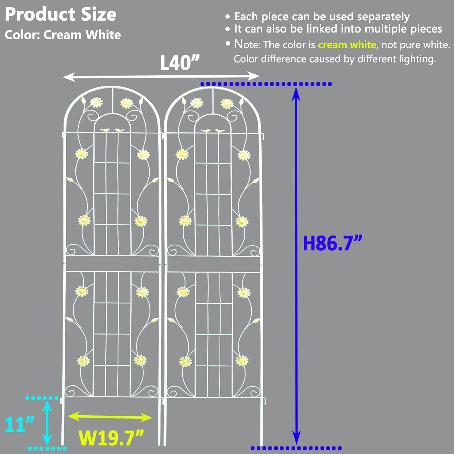 - Plants Supporting Trellis: This Cream White metal garden trellis is perfect for supporting all kinds of flowering trellis plants, wall-climbing vines. It allows them to grow naturally up towards the top.