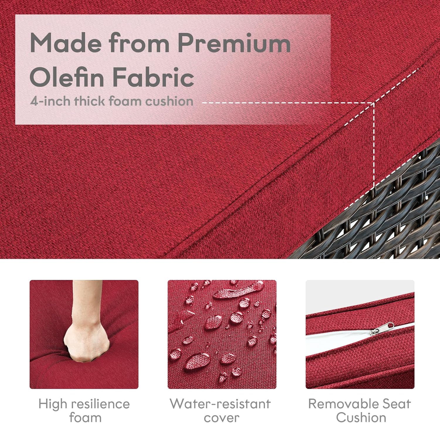 - Comfortable And Easy To Clean: Each glider chair and sofa in this outdoor set comes with a 4-inch thick foam seat cushion and an 8-inch thick cotton back cushion, which is ergonomic and enhances the overall comfort of the chair. The chair cushion cover is made of outdoor professional olefin fabric which is water resistant, and the seat cushion is equipped with zippers that are removable and easy to clean.