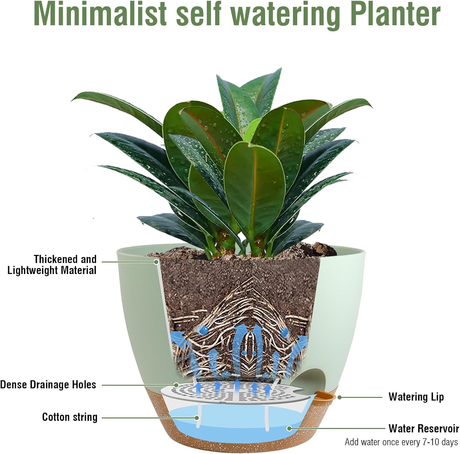 - 【Self Watering Design】 Self watering pots is includes a water reservoir at the bottom of the planter. This flower pots automatically supplies water to your plants as needed by a cotton rope, reducing the frequency of watering and ensuring your plants never go thirsty. The reservoir design also helps maintain a consistent moisture level, fostering optimal growth conditions.