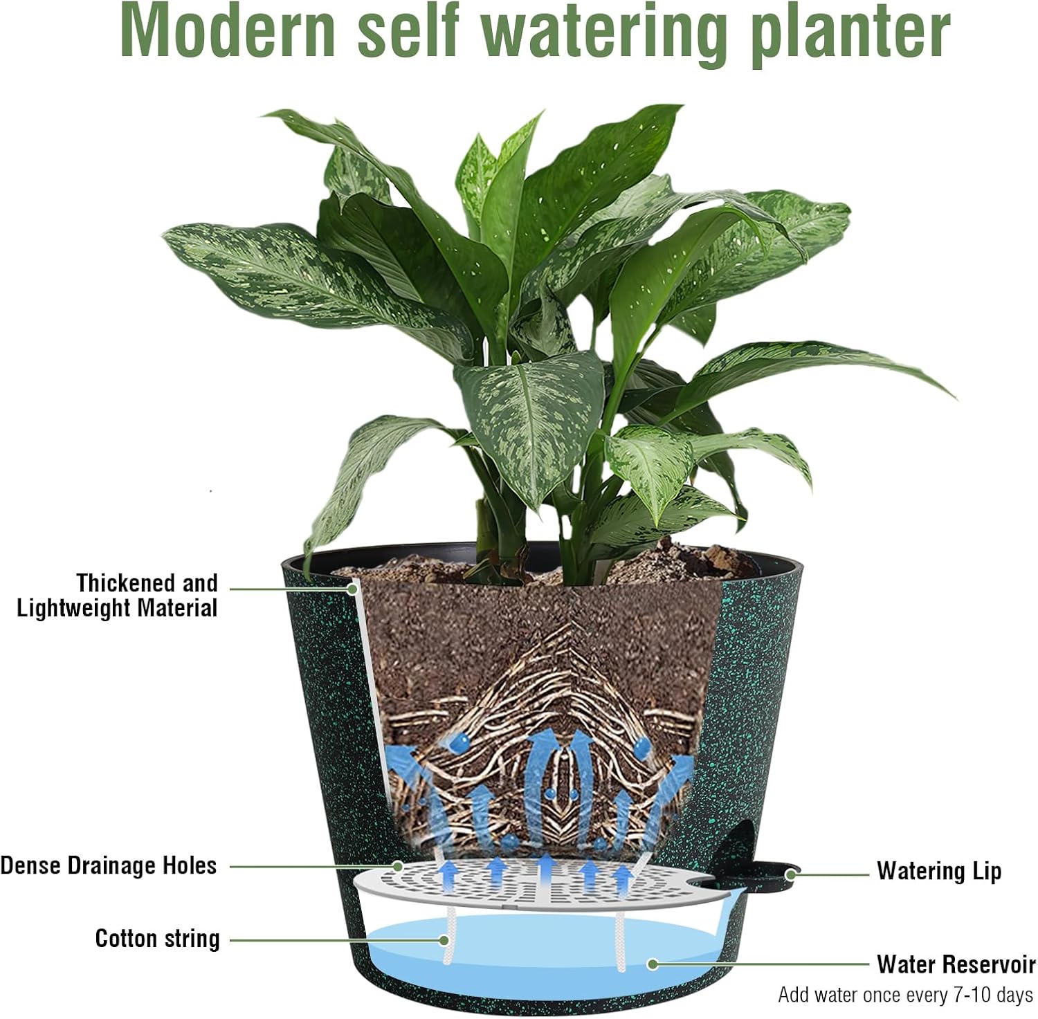 12 inch Large Self Watering Pots for Indoor Outdoor Plants, Flower Plant Pots with Mesh Drainage Holes for Garden, Plastic Planters with Reservoir for Home Plants, Black with Green Speckles