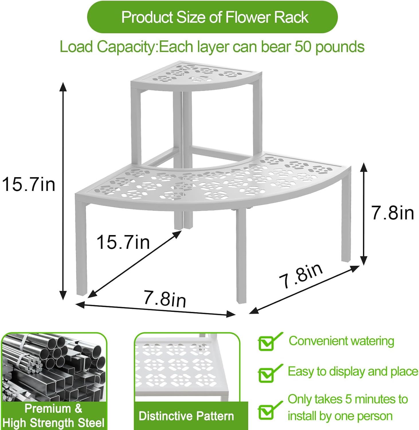 - 【2 Tiers Corner Shelf】This plant rack features 3 tiers to showcase your beautiful flowers, succulent collection, yard decorations, garden tools, and so on. 90° design is saving space and ideal for placing it in the corner.3 tiered plant stand provides large storage space, allowing around 9 different size flower pots be displayed.