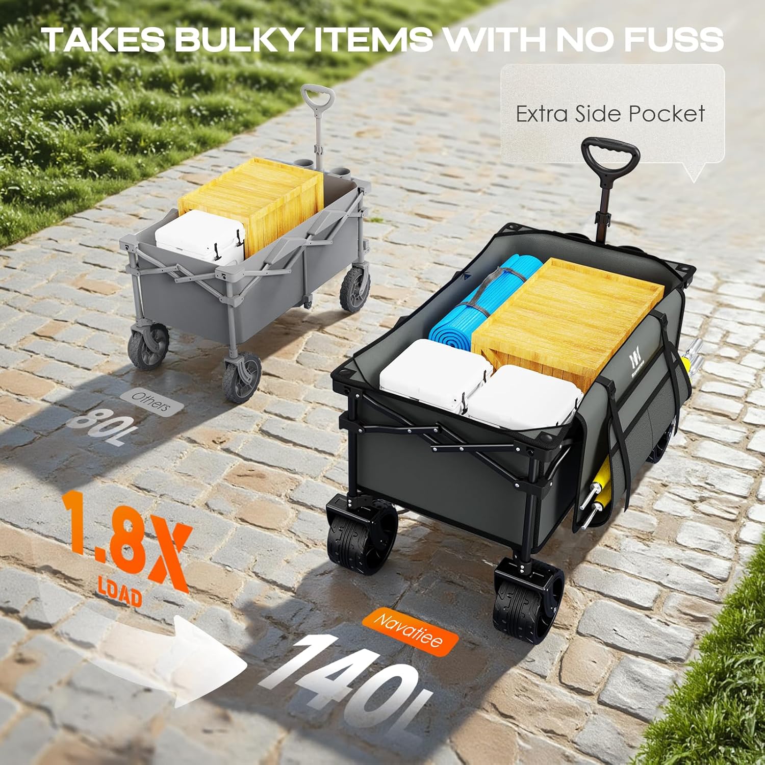 - START YOUR WONDERFUL TRIP : It can sound exhausting when you consider all the gear you're carrying at the beach or outdoors. Don't worry, Navatiee folding wagon cart will help ease your burden, it could help you shift all of the cargo out of your arms and onto a sturdy wagon and make it so much easier on yourself. It's an excellent option for outdoors and it can also be used to carry groceries, fishing, athletic equipment or your camping gear.