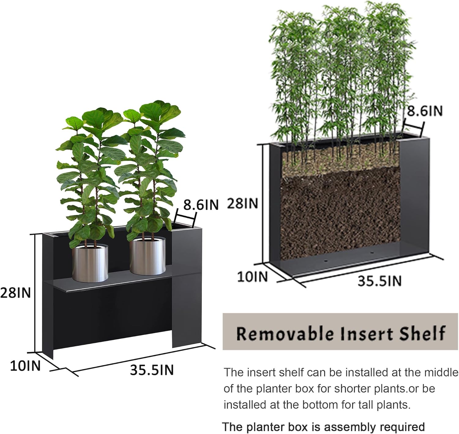 - [Size and Accessories]: 35.5*10*28 inches large flower planter, we are equipped with 12 screws, a hexagonal screw wrench, 4 foot pad , Note: This metal flower box needs to be assembled. The screws are fixed on the board and need to be unscrewed before installation!