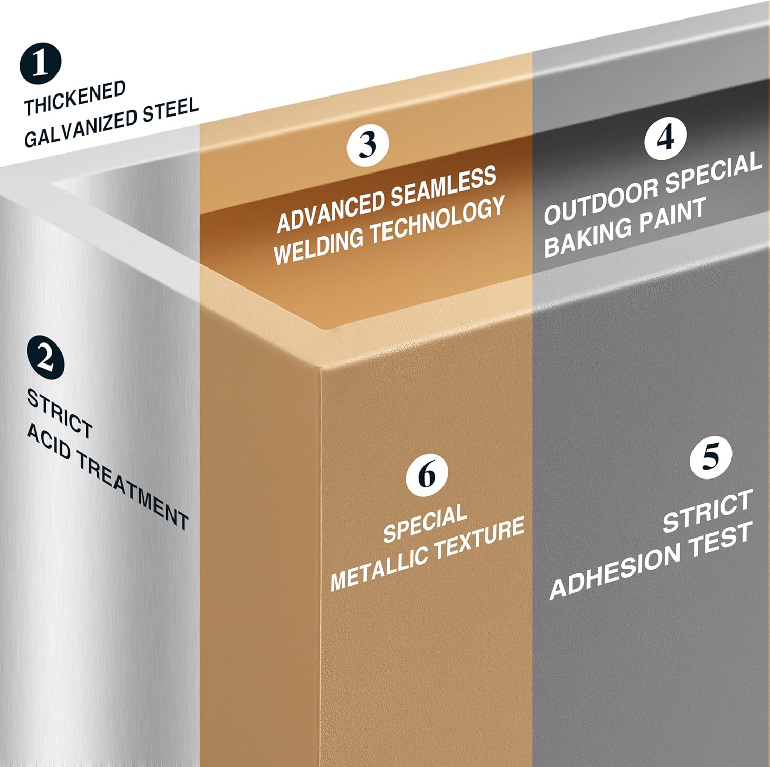 - 【Span Metal Planter】This tall planter box is made from a fully seam welded thick galvanized steel, and adopts outdoor special baking paint, giving the surface a premium metallic color and special texture through the advanced powder injection process.