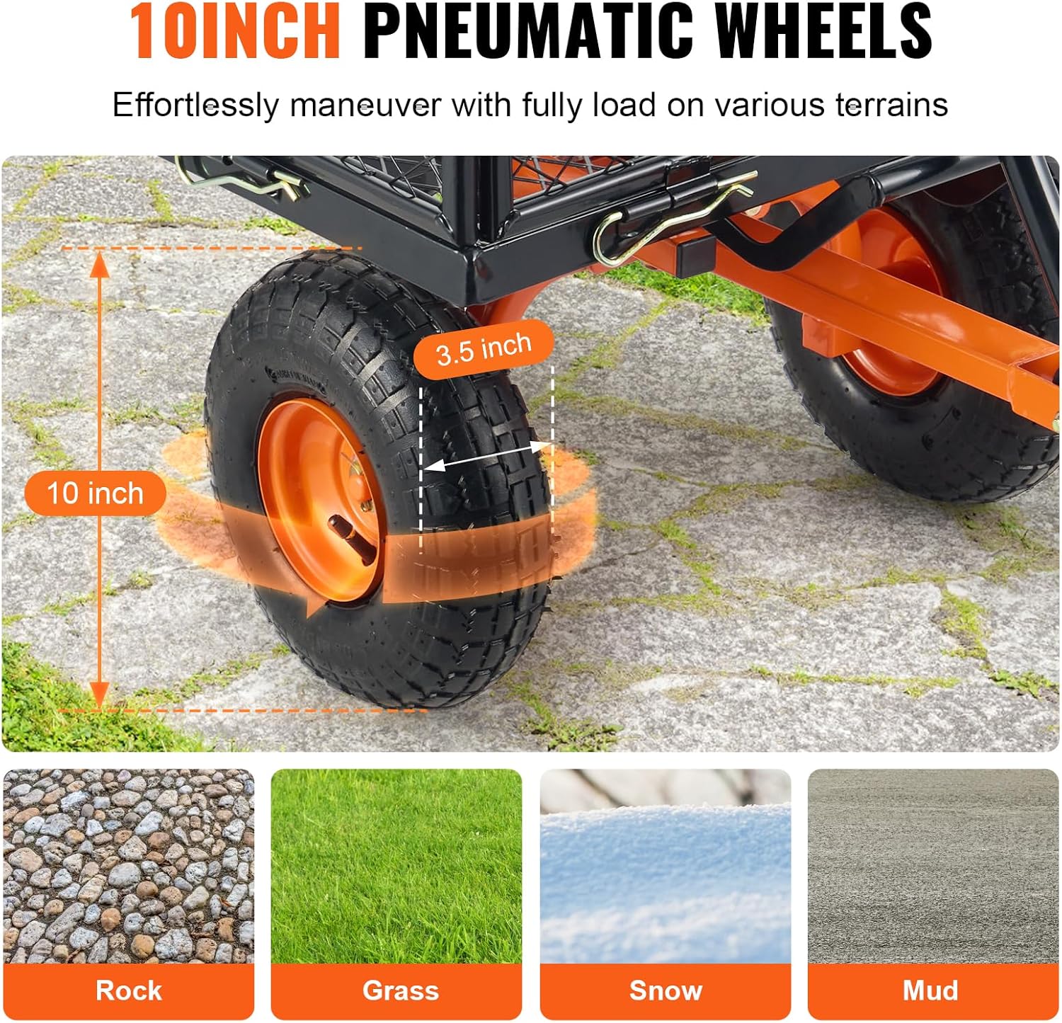 - Large Tire Size: With ΓΈ255mm/10" rubber tires, the yard cart provides excellent shock absorption, navigating uneven garden terrain or grassy slopes, ensuring smooth transport.