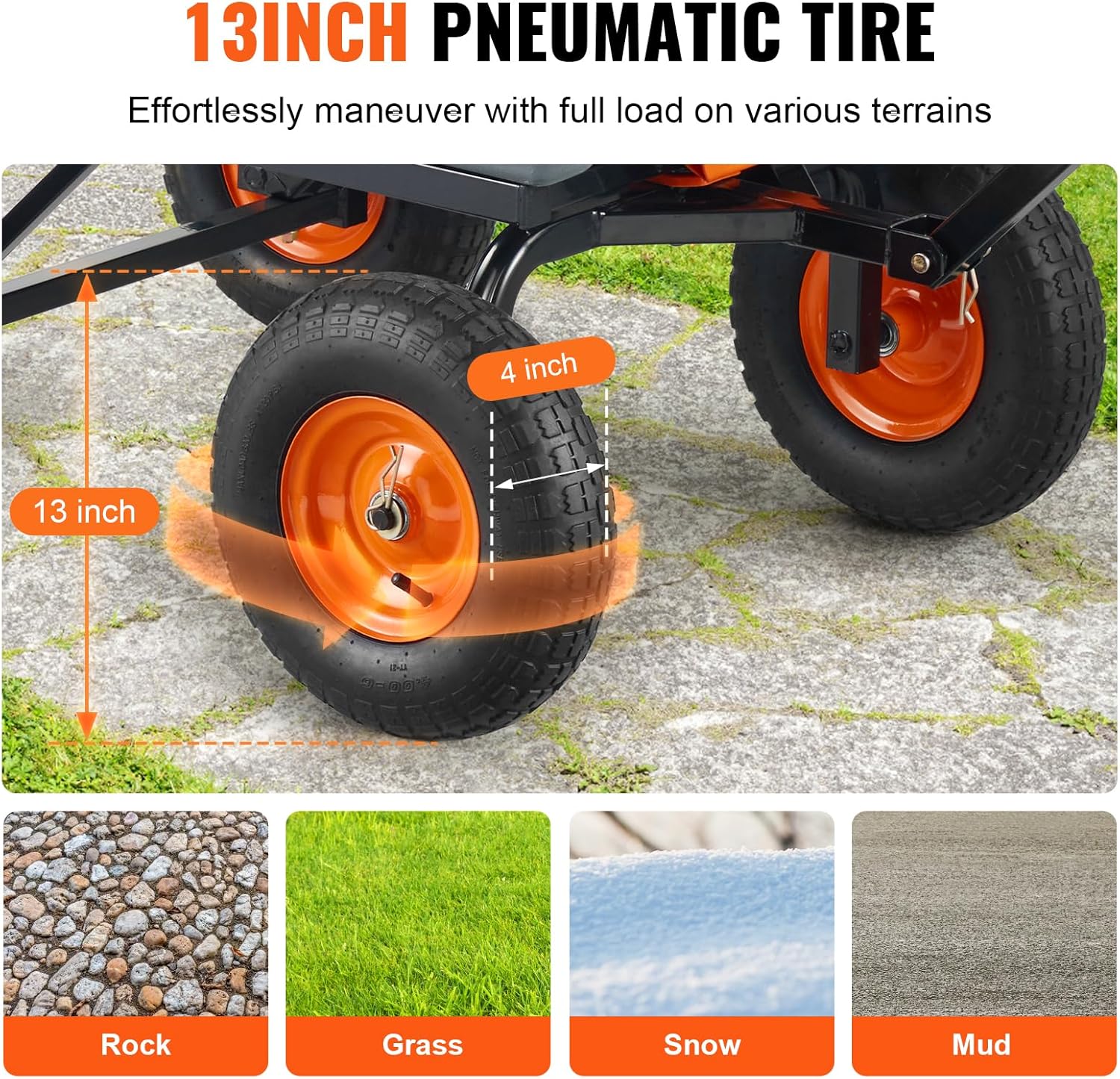 - 13in ALL TERRAIN WHEELS: With 13" large rubber tires, the yard cart provides excellent shock absorption, navigating uneven garden terrain or grassy slopes, ensuring smooth transport.