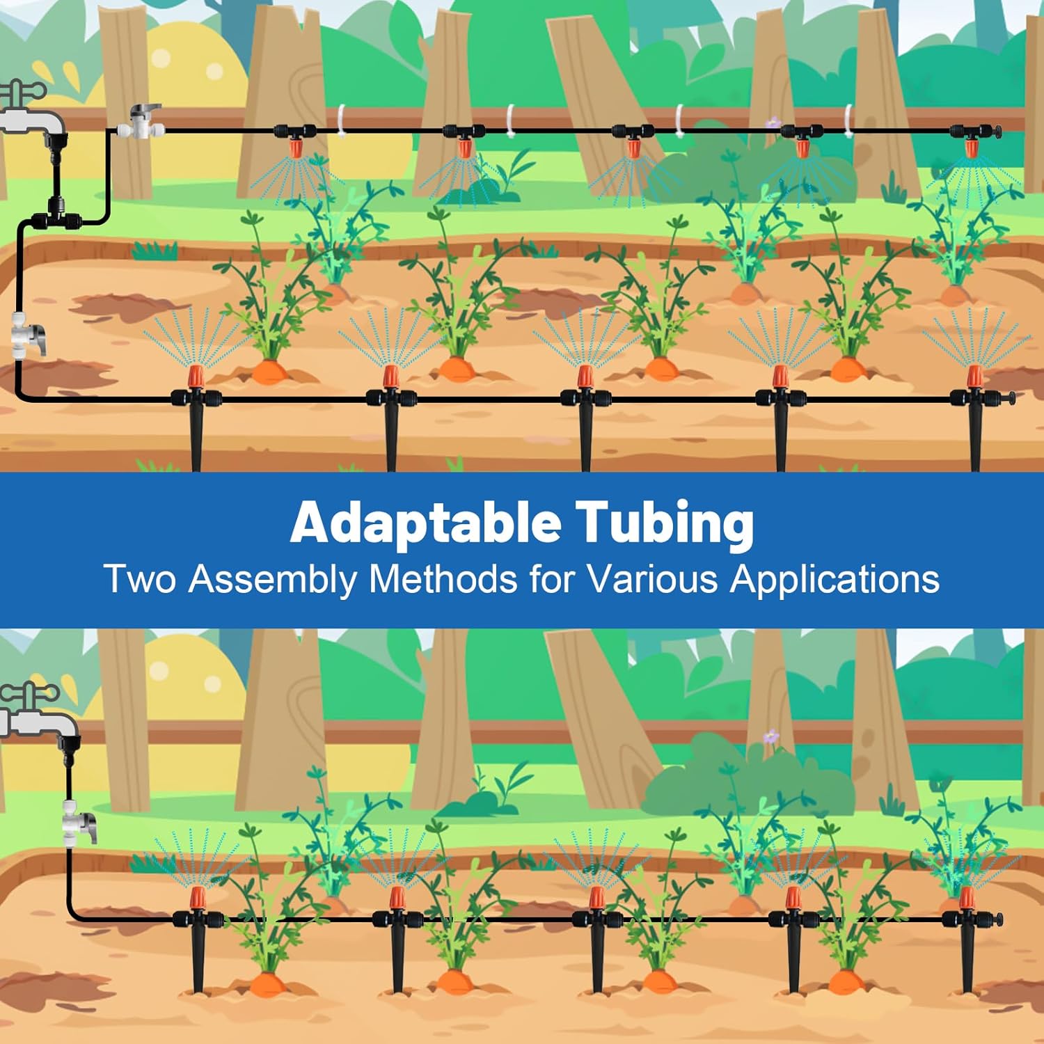 - 【Flexible Dual-connector Customizable lrrigation】Adiust the setup to fit your space with one or twoirigation lines.Whether you have a small garden or a large field, you can easily customize your waterincsystem to suit your specific needs, ensuring every plant gets the hydration it requires