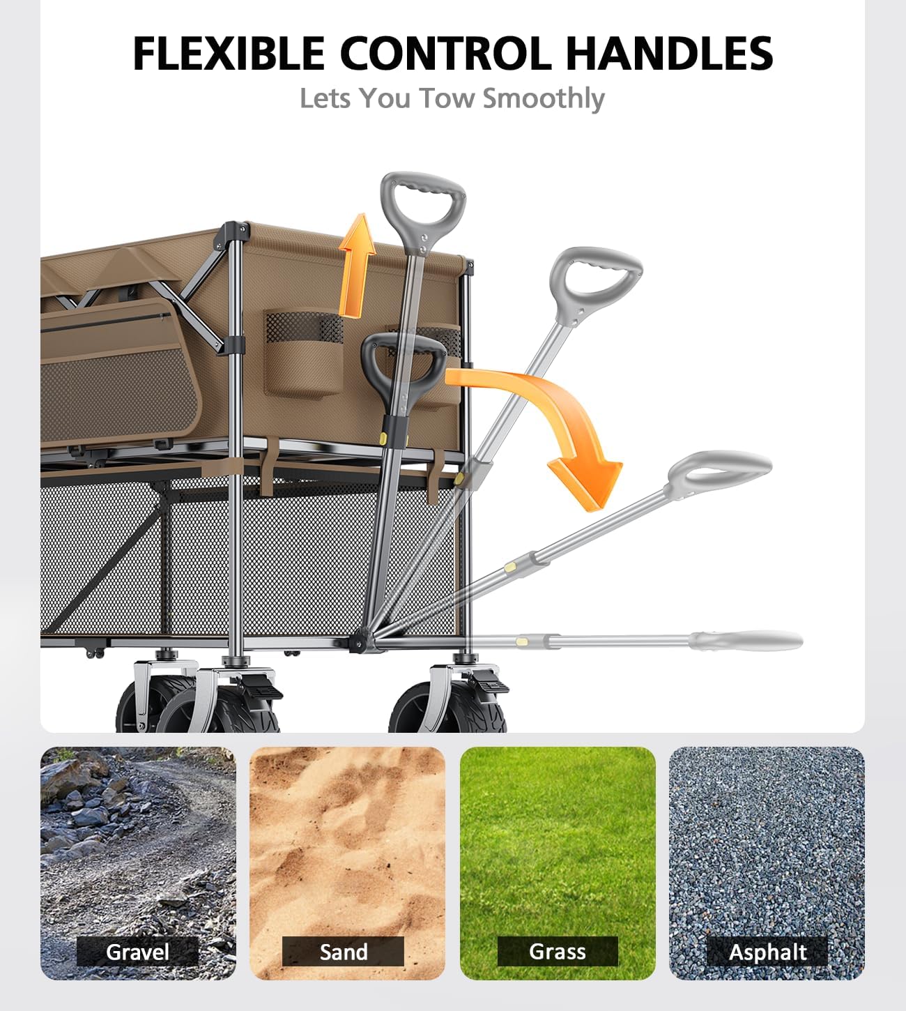Foldable Wagon Cart,Everyfun 480Lbs Double Decker Wagon,Beach Carts with Big Wheels&Side Pocket&Dustbag,Large Capacity Folding Wagon for Shopping,Garden,Camping,Fish,New Wave Sports Wagon-Brown