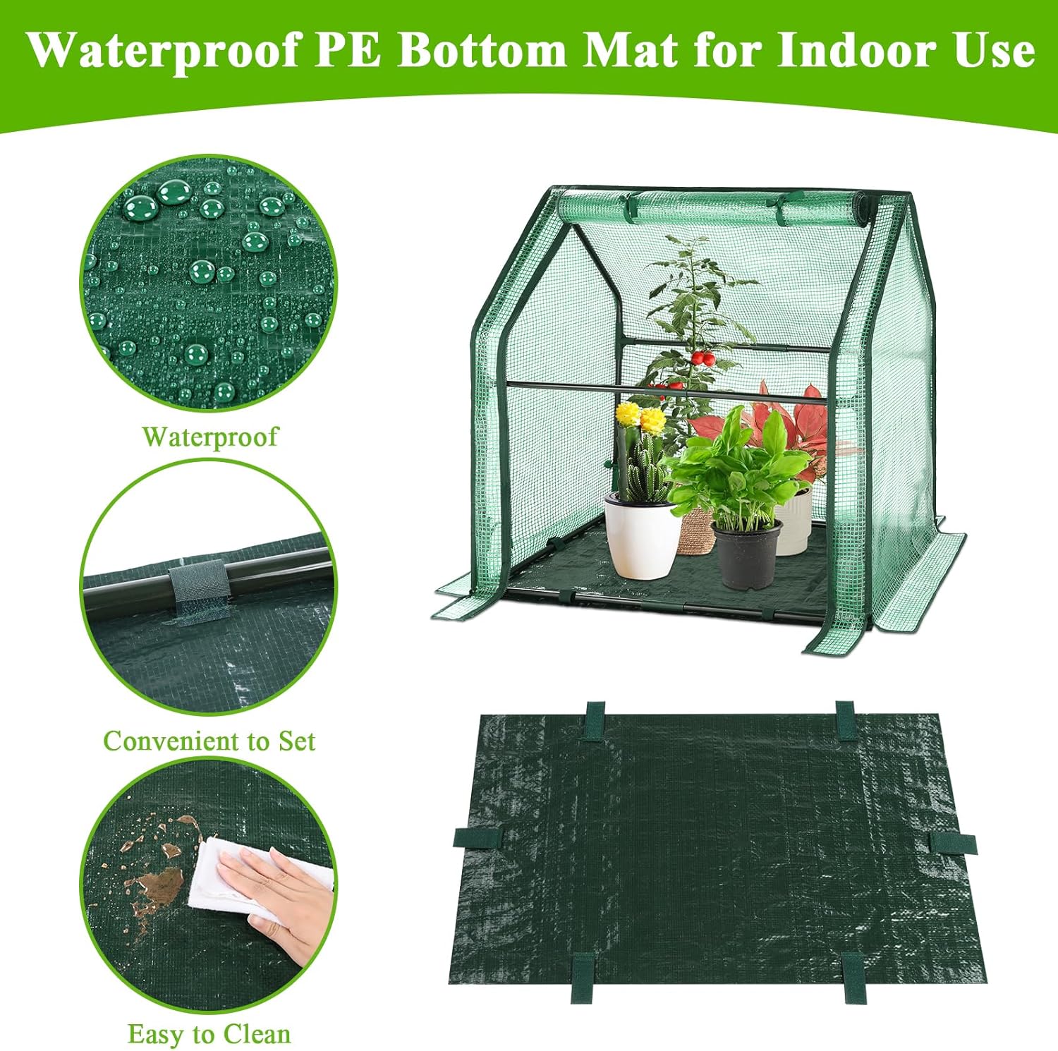 - With Waterproof Mat: Our green house for plants comes with waterproof mat, easy to use, avoid dirtying the ground when watering or pruning plants, and it can effectively keep warm when the temperature is low