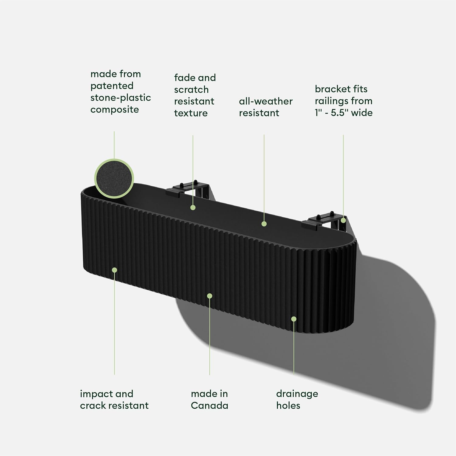 - DURABLE MATERIAL: Made from a plastic-stone composite, this railing planter box has a subtle textured finish and is all-weather resistant to cracks, scratches, UV and fading; perfect for hot or cold climates ranging from -20 to +120 degrees