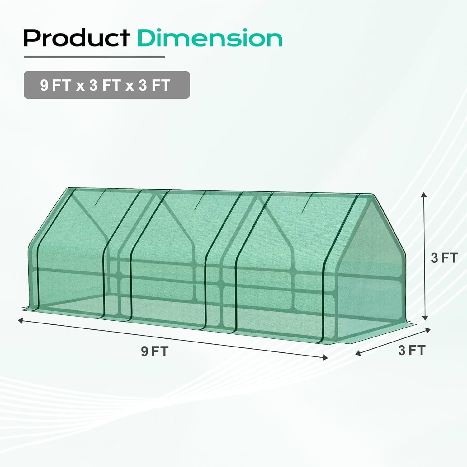 BPS 9x3x3 ft Mini Greenhouse with Green PE Cover UV-Protected Roll-Up Zipper Doors, Ideal for Indoor or Outdoor Use on Raised Garden Beds