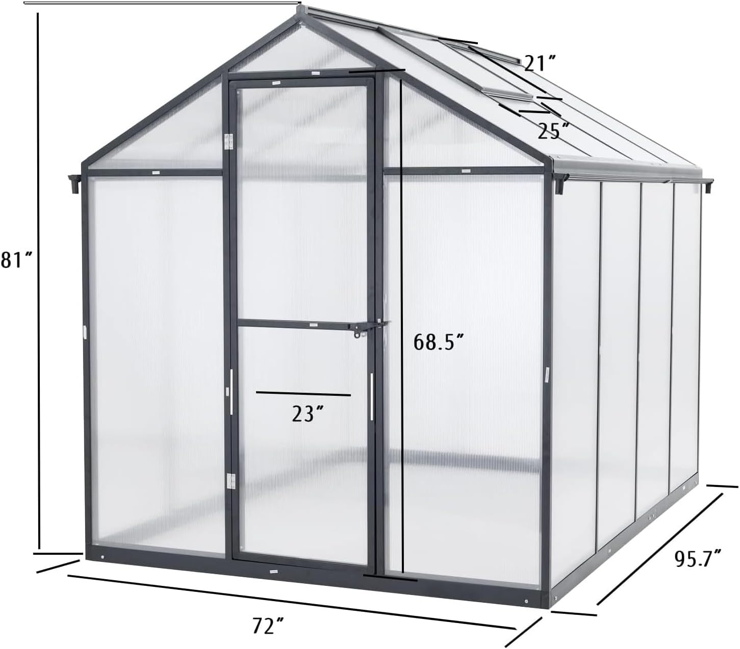 - Large Size - Greenhouse size: 77“x97"x81". Door size: 68.5"x23". Foundation size: 72''×95.7''. This greenhouse is the perfect size for backyards, decks and gardens. Ideal for the casual gardener or flower lover to grow a variety of vegetables, plants, flowers and herbs. It can provide you with plenty of space for plant preparation and growth.