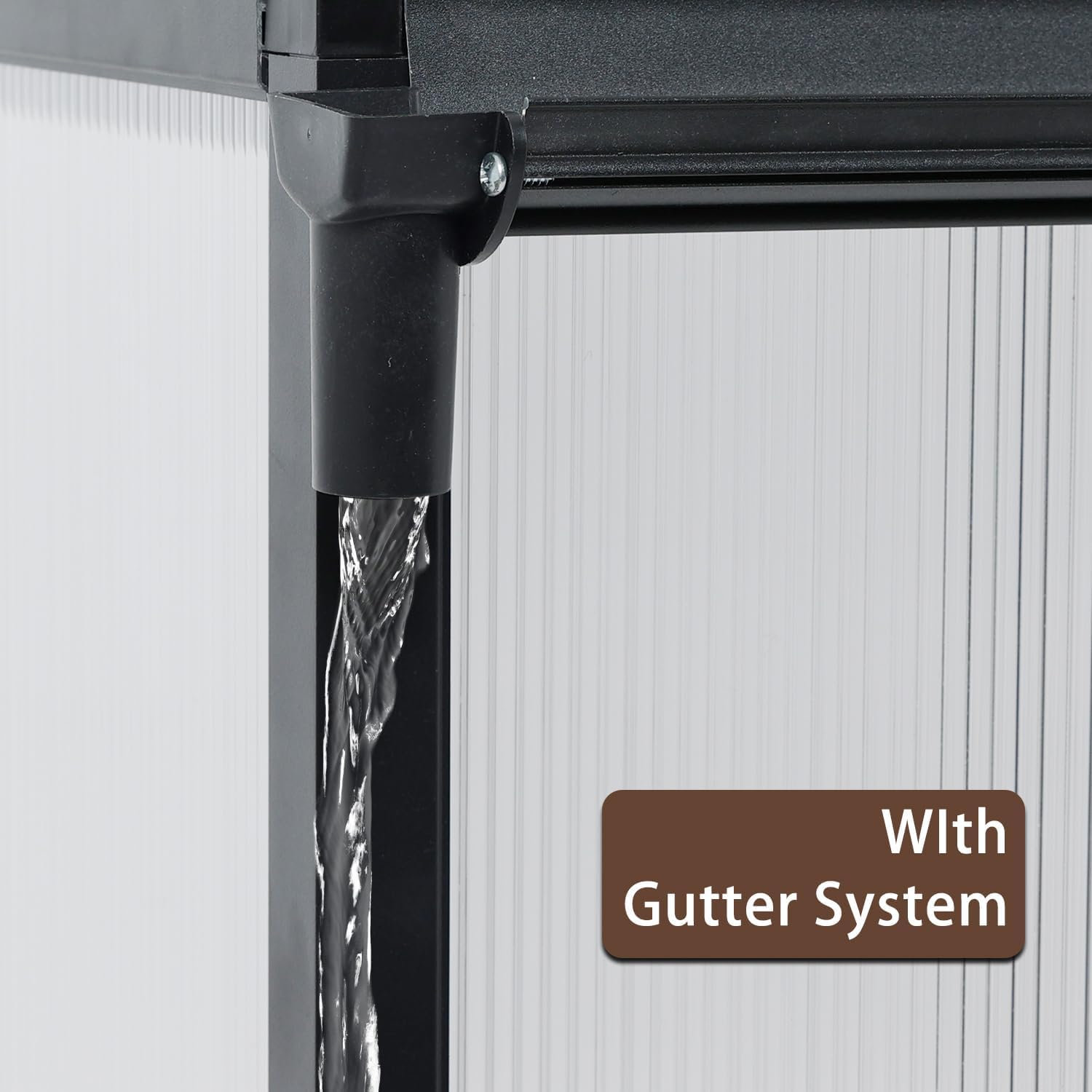 - Premium Panels - The greenhouse is made of high quality 4mm polycarbonate panels, which is better than market products for water-resistance, shading and stability. And with the leaking pipes, there will be no accumulation of water. Easy to clean up.