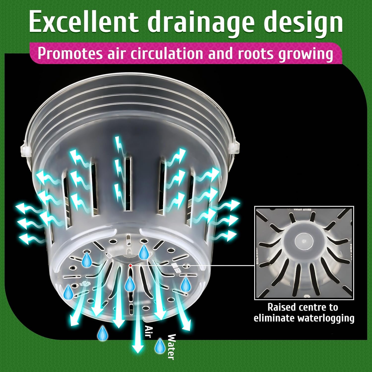 - [VENTILATION AND DRAINAGE DESIGN] Our orchid pots with holes mimic the natural growing conditions of orchids. Each orchid pot has many drainage holes on the sides and bottom. This provides air circulation for the plant roots and also drains excess water for plant growth. The bottom of the orchid pot is raised in the middle to help eliminate waterlogging. The hole slots are well sized so that the potting medium does not fall out