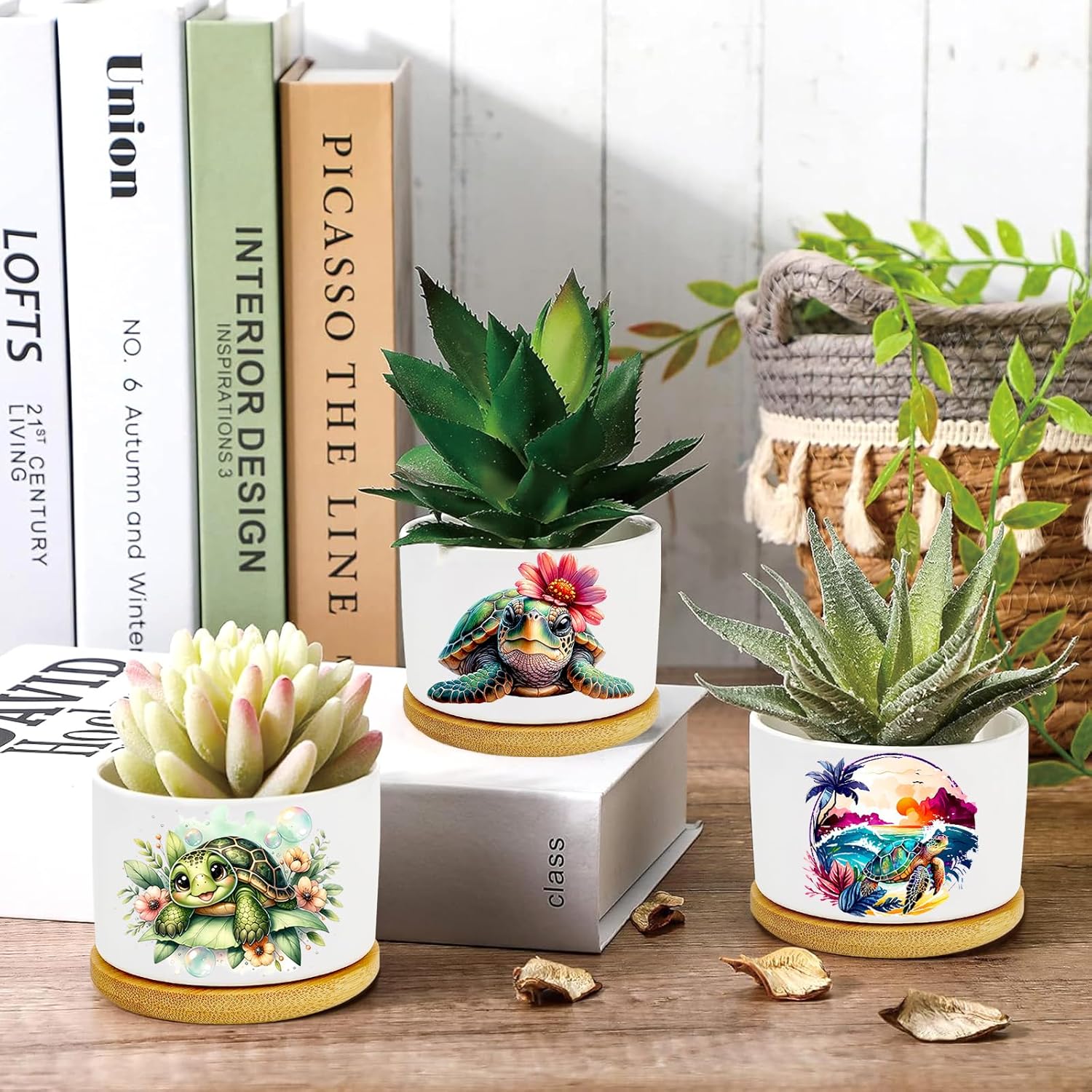 - Sea Turtle Print Suff Turtle Decor - Beautiful sea turtle patters designs,glazed inside and outside, with a drainage hole and they supply the mesh for the bottom of the pots. keep your plants grow and breath in health and safe. Made of sturdy terracotta, so no worries about breaking them. Very securely packaged in thick foam trays;Pot size is 2.75 inches high, 3.74 inches wide. Tray Material is premium bamboo, Tray size is 3.74 inches wide, 0.39 inches high.