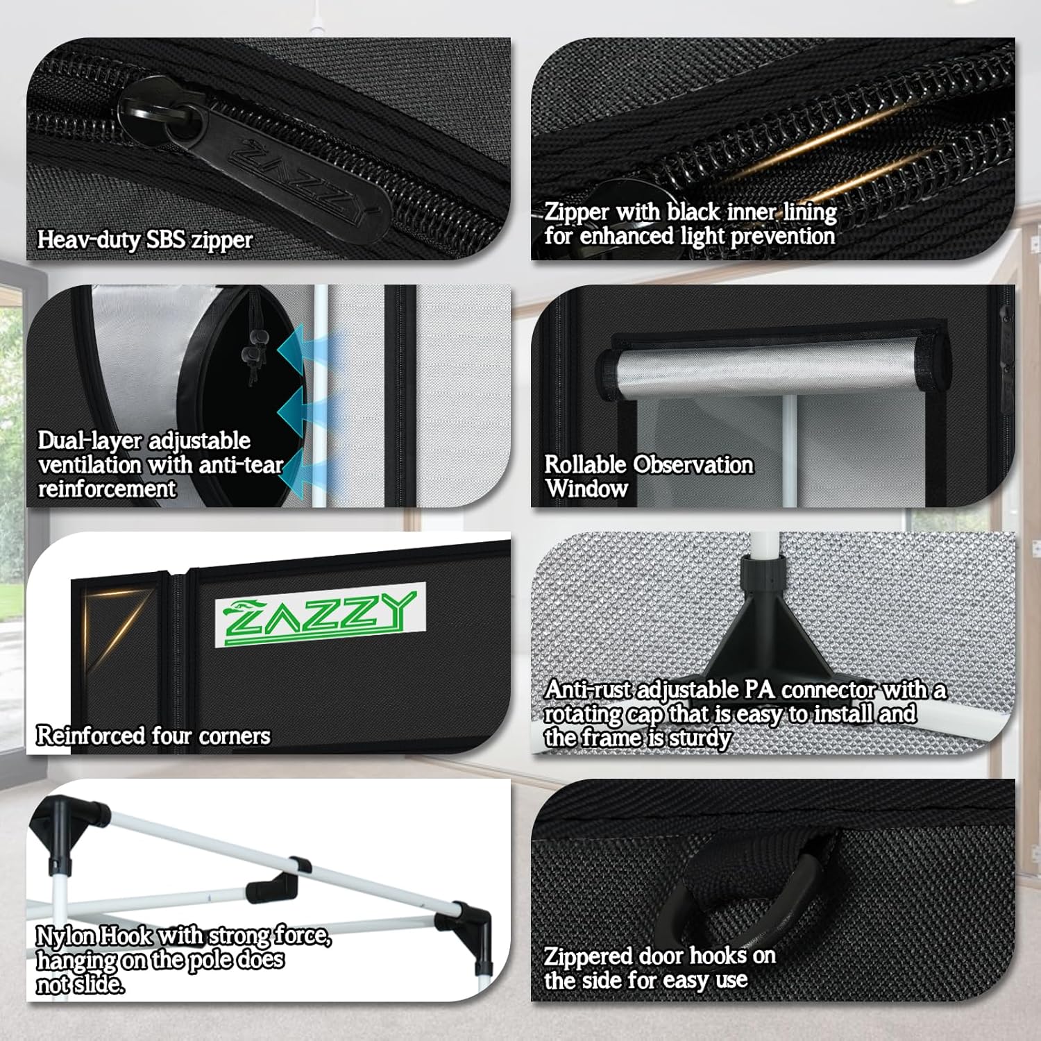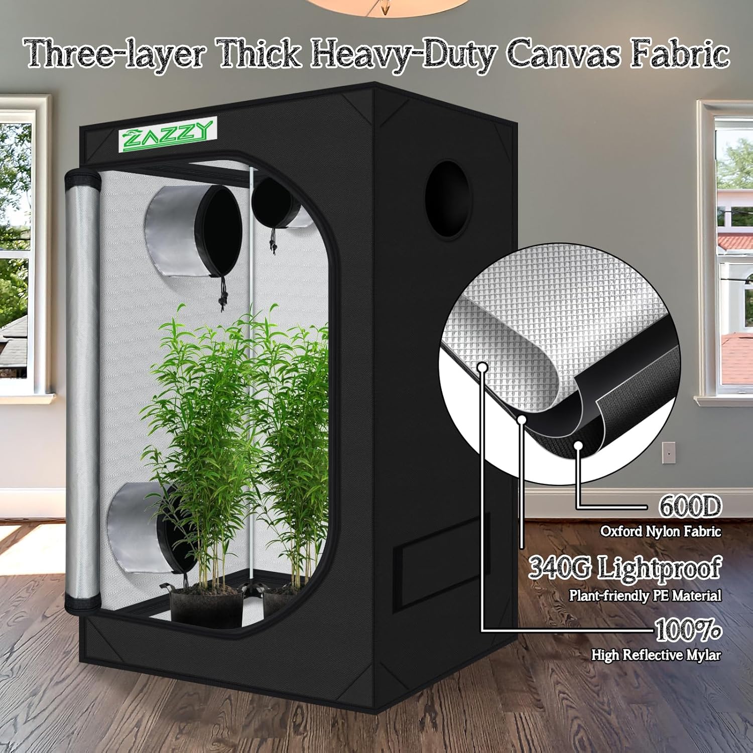 - Top-Quality Materials and Sturdy Frame --- Zazzy plant grow tent made of superior quality reflective 600D mylar and double stitched to ensures the light blocking. Heavy duty all steel poles which are rated to handle at least 110 lbs. The frame is specially finished to ensure smooth installation and safe handling.