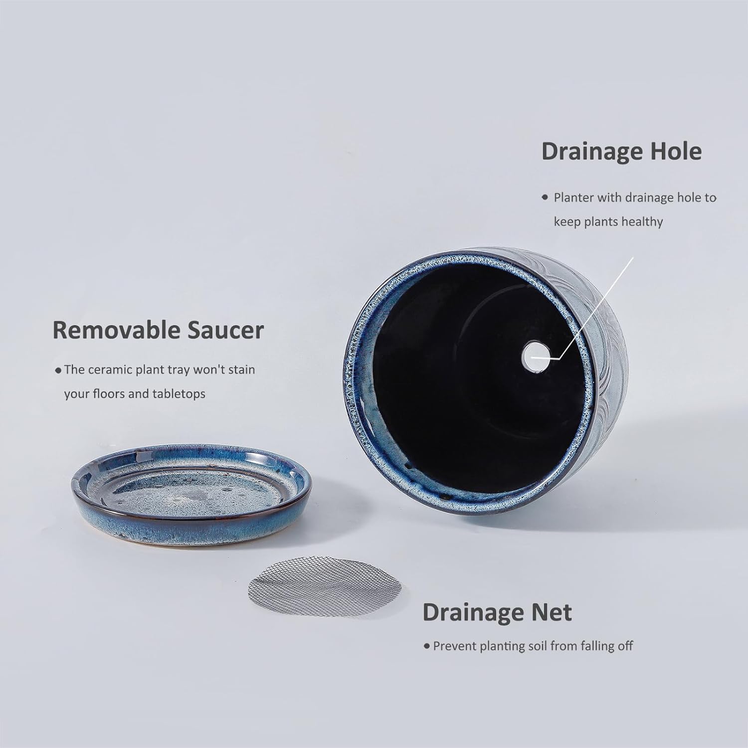 Plant Pots Indoor, Ceramic Planter, 6in Plant Pot, Plant Pots with Drainage Holes and Saucers, Flower Pots for Indoor Plants, Reactive Glaze Blue