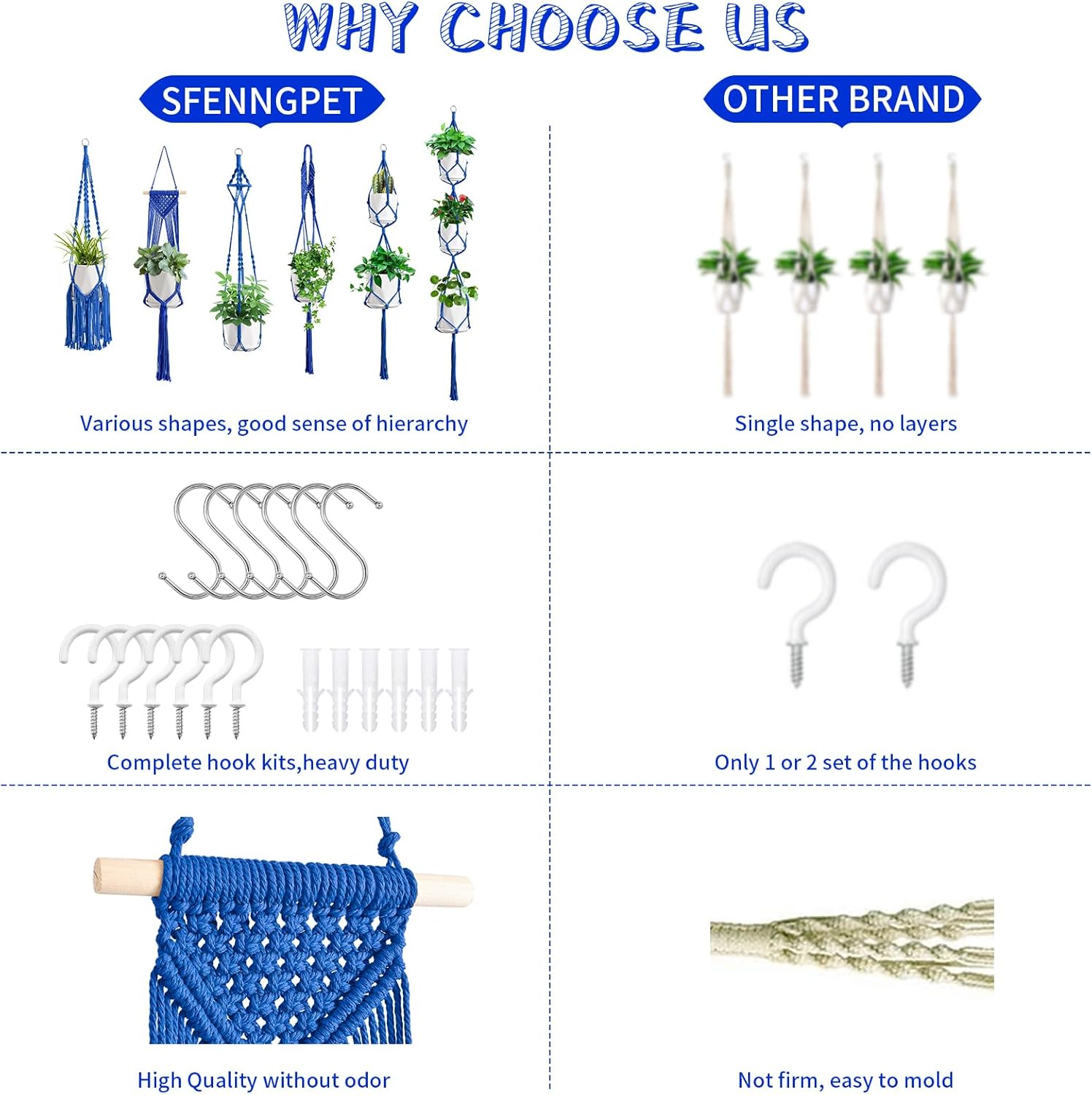 Macrame Plant Hangers, 6Pack Hanging Planters for Indoor Plants w/ 6 Set Hangers Kit Handmade Macromay Plant Hangers Indoor Flower Pots Holder Stand for Boho Home Décor (POTS NOT Included)