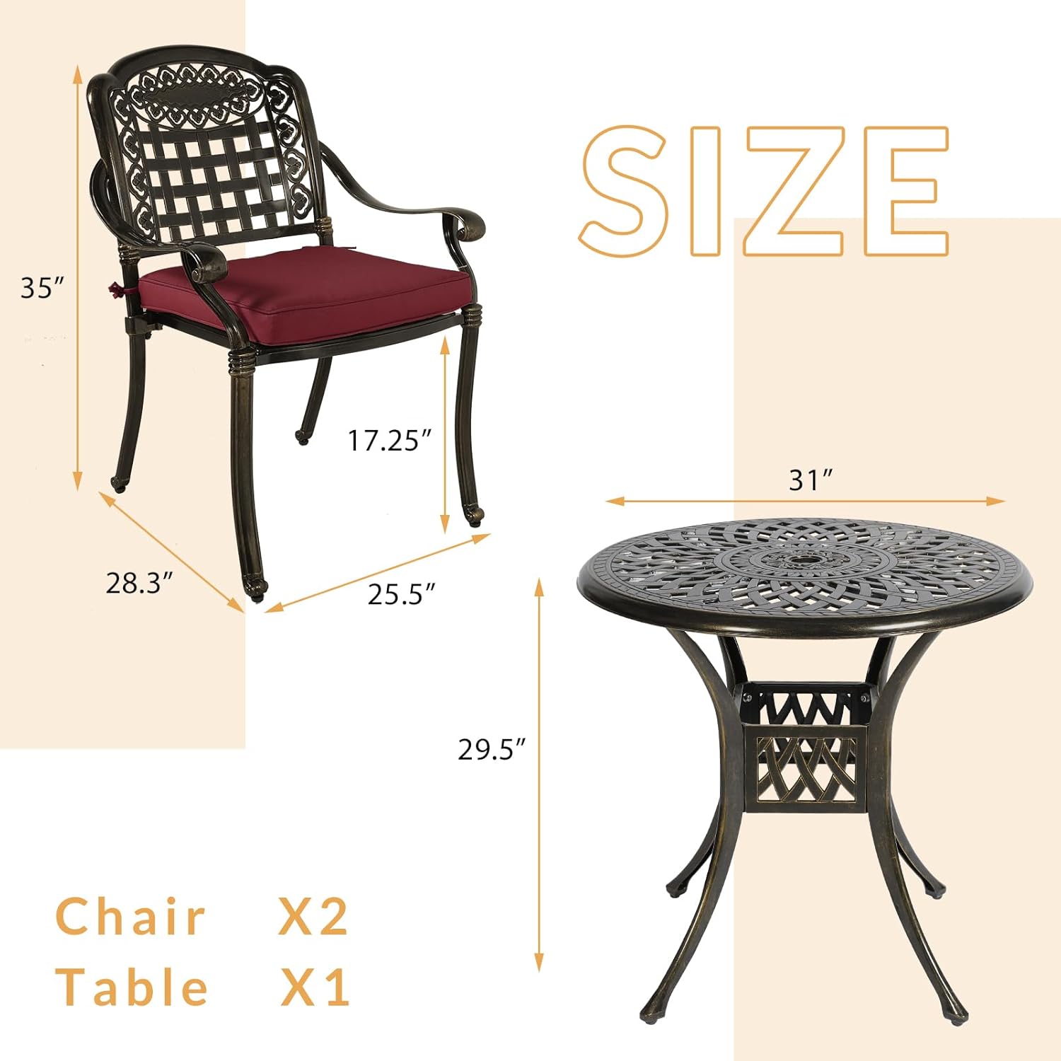 3-Piece Outdoor Patio Dining Set, All-Weather Cast Aluminum Patio Furniture Set for Backyard Garden Deck with 2 Cushioned Chairs and 31” Round Table, 2" Umbrella Hole, Chili Red