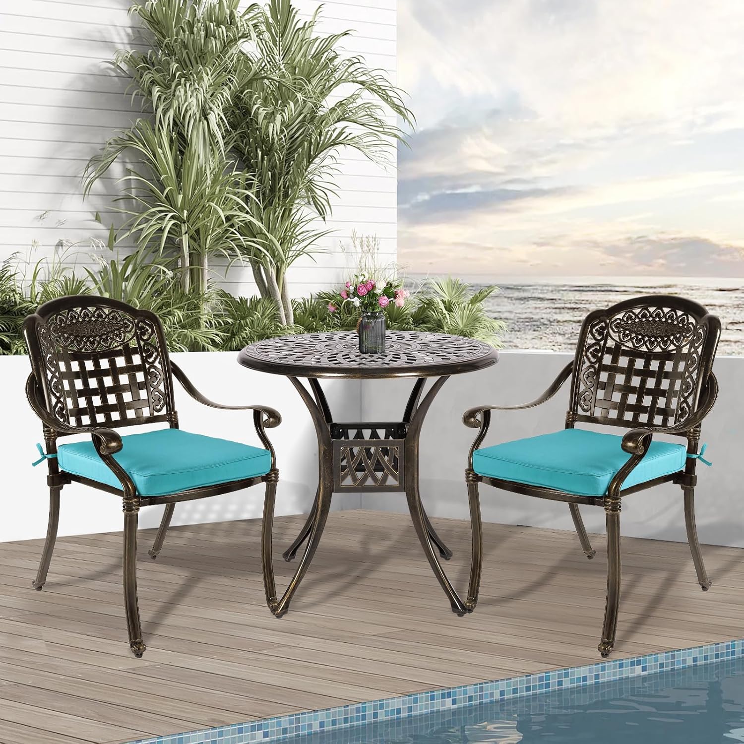 - 【Durable 3-Piece Dining Set】 - Made from cast aluminum for long-term durability. Resistant to rust, weather, fade, crack. This patio set includes 1 round table, 2 chairs, 2 cushions, and they stay in perfect condition regardless of the weather. It's also easier than ever to clean, just use a dry or damp rag to wipe down.