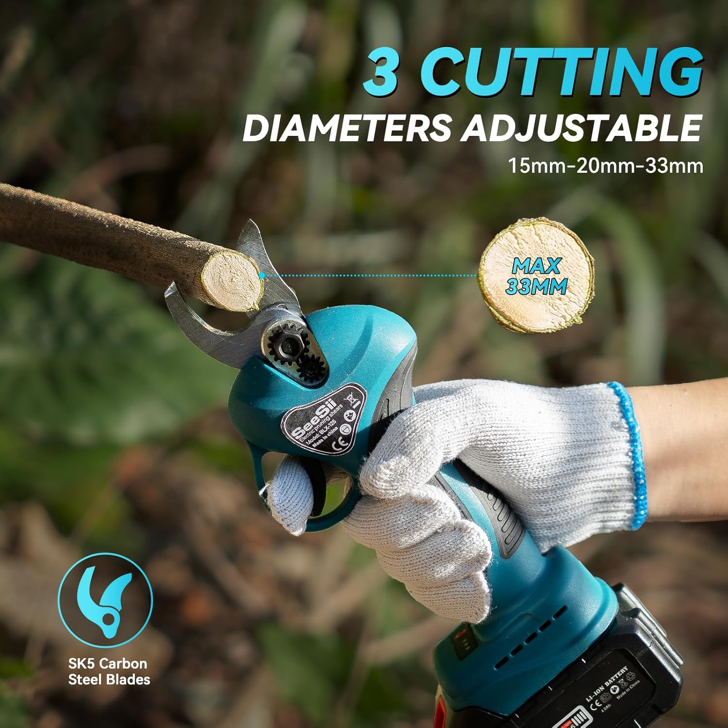 - Professional-Grade Cutting Precision: The SEESII electric pruning shears feature premium SK5 steel blades paired with a responsive 21V brushless motor, delivering exceptional cutting performance. These cordless pole pruning shears make clean, precise cuts through branches up to 1.2 inches thick, promoting healthier plant growth while reducing strain on your hands. Perfect for detailed garden shaping or precise fruit tree maintenance