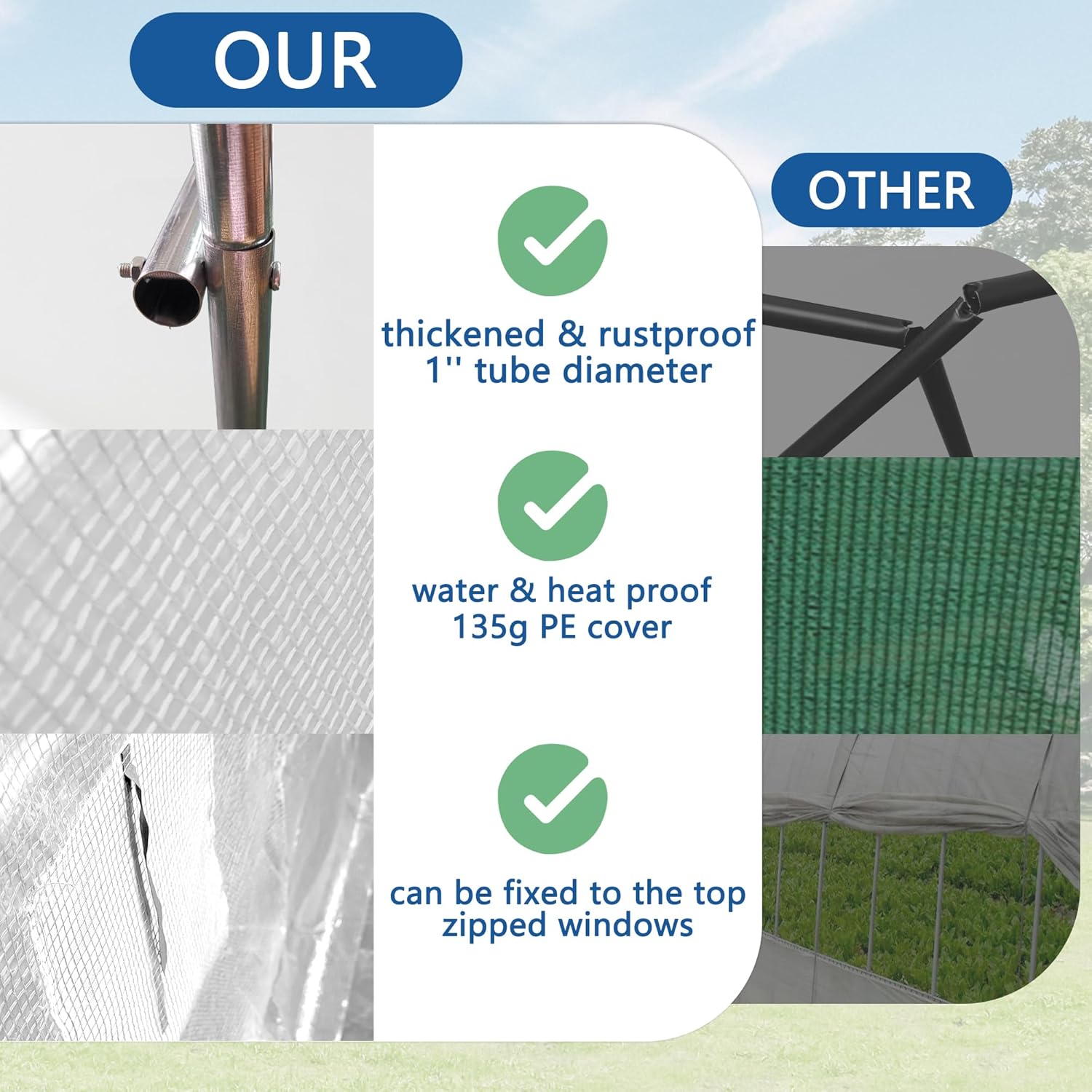 - 【Outdoor PE Cover】 This green houses for outside coated with a UV protective coating to provide your plants with comprehensive protection from sun, rain and snow and control heat, humidity and stop sun damage by blocking UV.