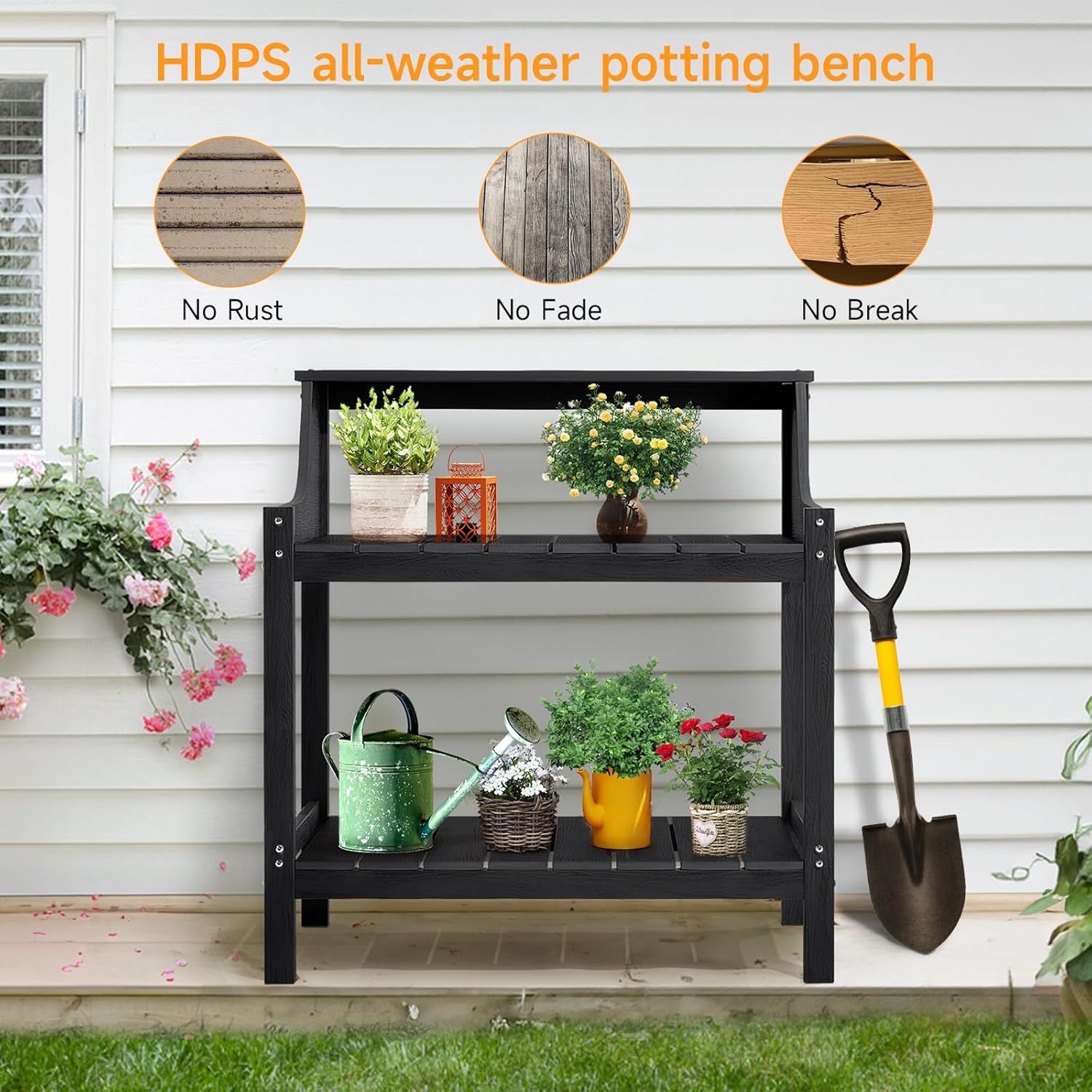 - 【100% HDPS material】This potting bench is made of Polystyrene, When it comes to outdoor use, potting bench table can no fading from sunlight exposure and won't rot due to moisture. The plastic wood material means you can confidently place it outdoors without worrying about its quality and appearance being compromised. It providing you with a long-lasting and enjoyable experience.