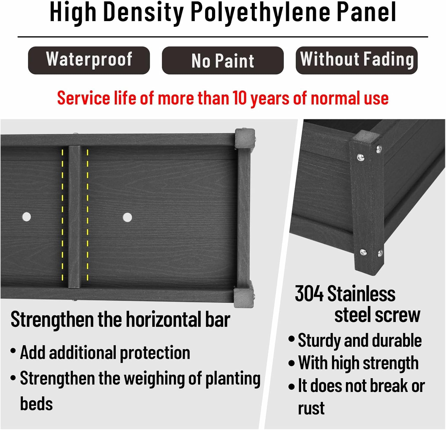 - Quality Materials: Elevated planter box is made of HDPE, It is waterproof, resistant to corrosion, does not crack, less prone to fading, weather-resistant,easy to clean,offering more advantages than wooden raised garden beds
