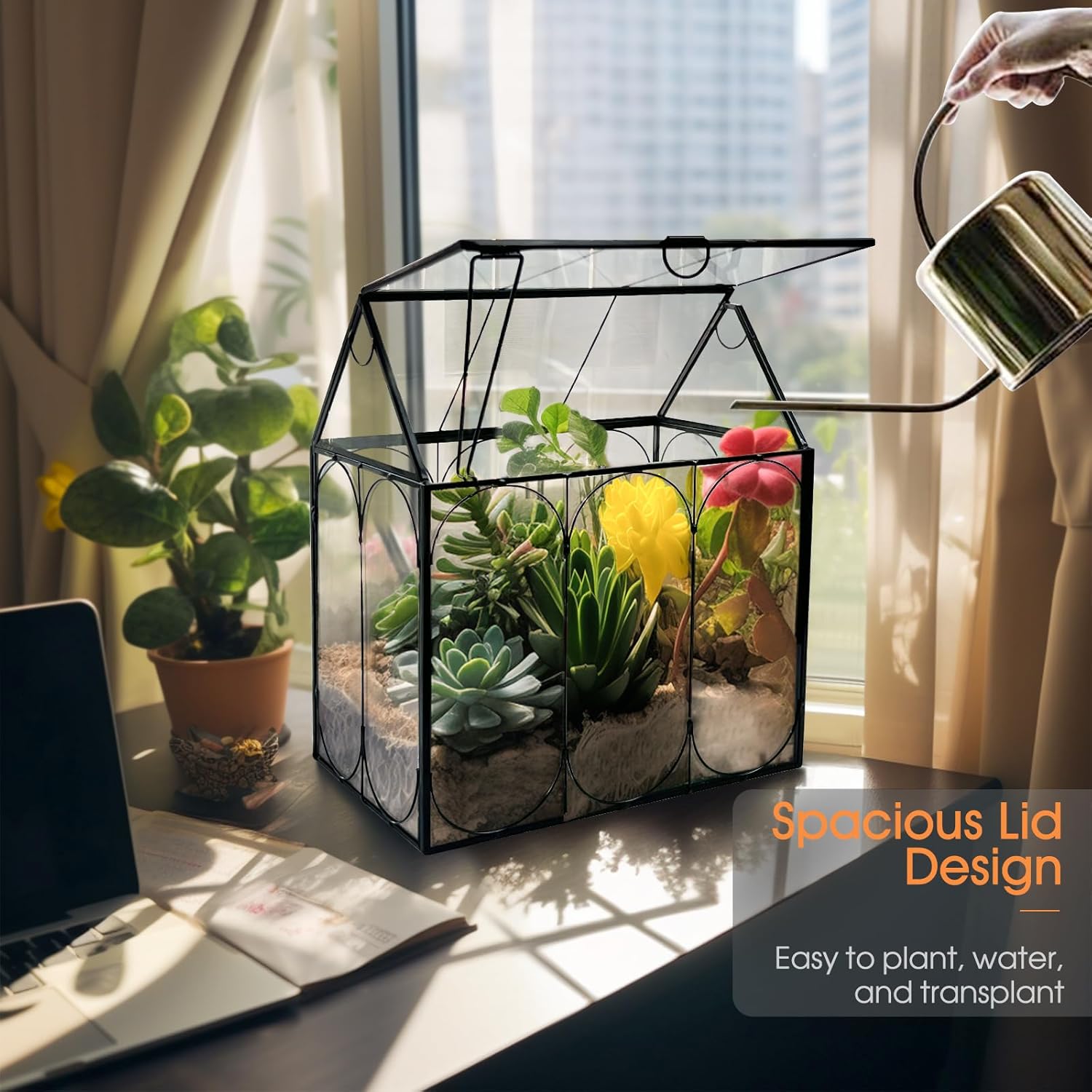 - 7.1"Lx4.8"Wx8.8"H Glass Plant Terrarium: Terrarium container made of ultra clear toughened glass and iron frame, which is not only sturdy but also durable. Plants are easily exposed to sunlight through glass, promoting photosynthesis. And you can enjoy a 360-degree view of your mini paradise through its house shape. With absorbent mat to prevent water from seeping into your desktop (notice: without plants)