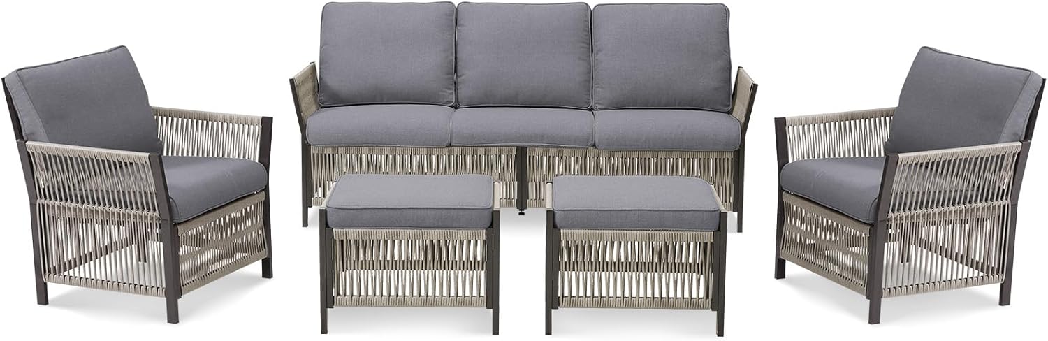 - Modern Aluminum Patio Furniture Set with Minimalist Design: This patio furniture set features a modern minimalist aesthetic with a sleek combination of faux rope rattan and exposed aluminum tubing, offering a lighter and more refined look than traditional bulky designs. Perfect for those seeking a sophisticated outdoor patio furniture set that complements any contemporary backyard or balcony