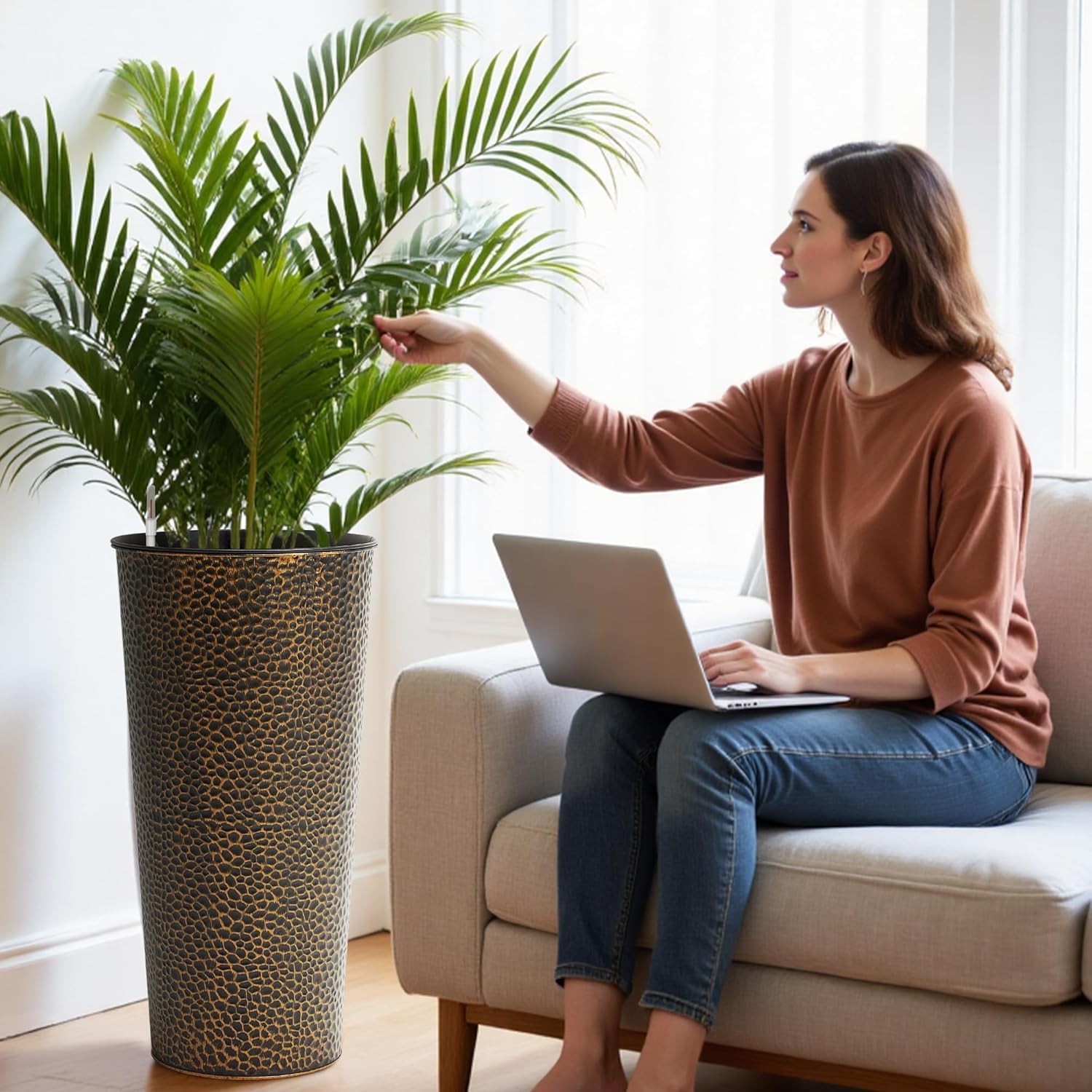 Worth Garden 2-Pack 28" H. Metal Planters with 2X Inside Pots - Hand-Hammered Texture Tall Narrow Cone Plant Pots - Large Handcrafted Bronze Flower Pot for Indoor Outdoor, Deck, Patio, Front Porch