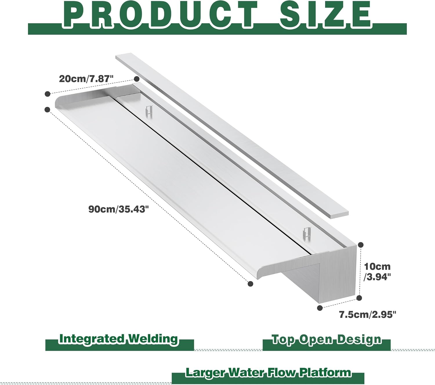 - ăAnti-Rust Spillway Waterfallă- The main body of this stainless steel spillway waterfall is welded together using 304 stainless steel for stable long-term use, featuring an top open lip design that creates elegant, invigorating, freefalling water effects to add a decorative touch to ponds and pools, letting you enjoy the relaxing sounds of water for a sense of calm and well-being. LED light strips not included, but available separately.