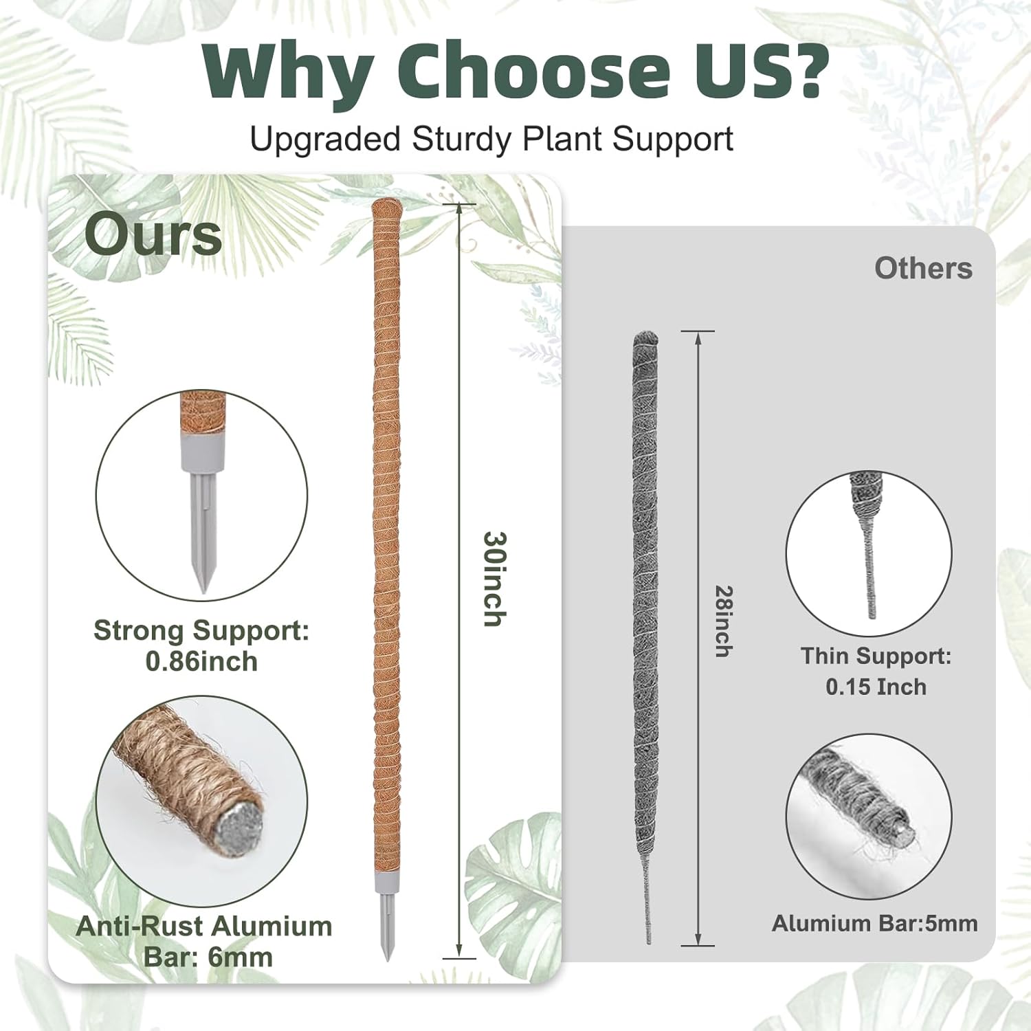 - What Included: Our plant stakes for indoor plants includes 3 of 30in moss poles and two kinds of plant ties. These ties are gentle on your plants, avoiding any damage to the stems, and can be adjusted as your plants grow, providing the right amount of support throughout all stages of development.