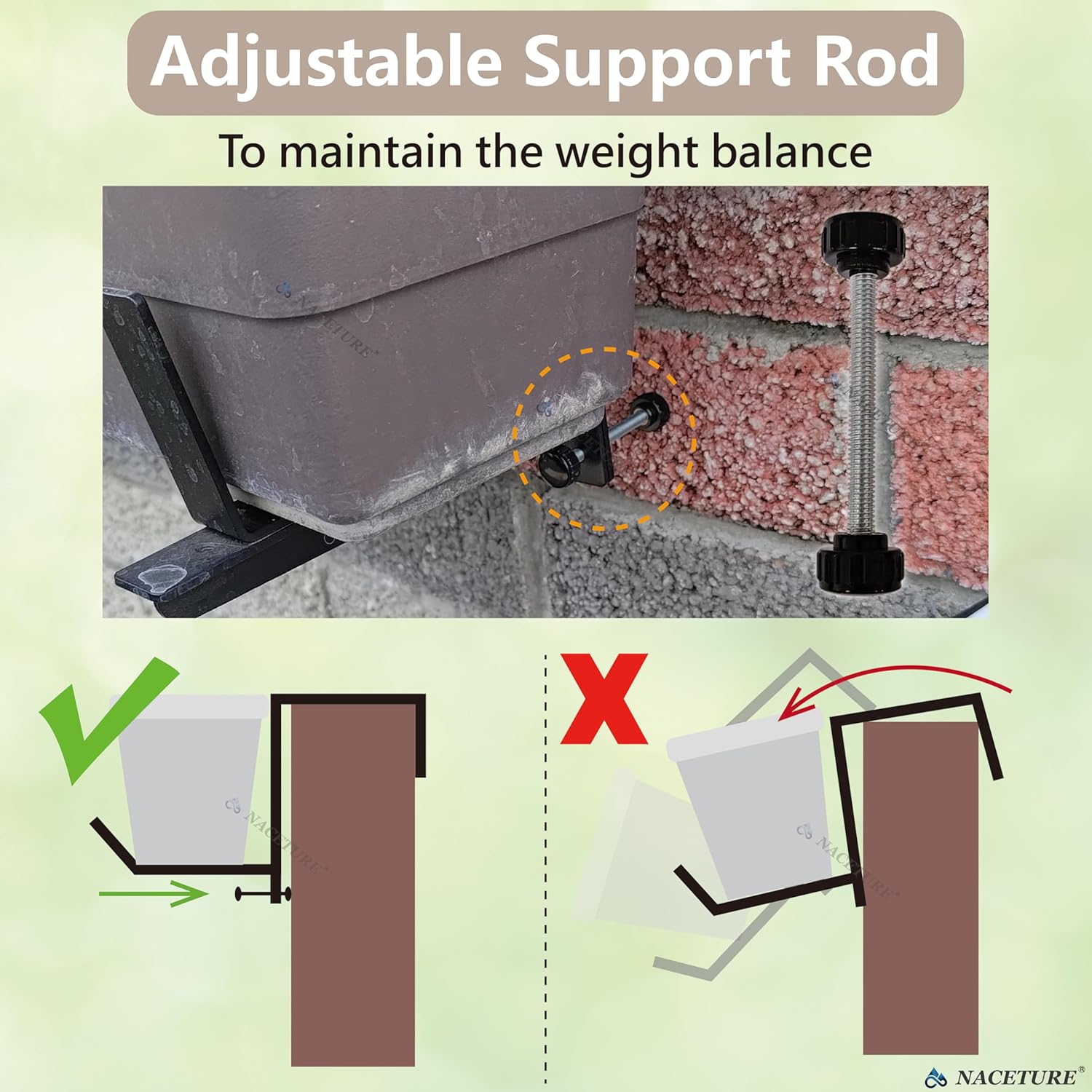 - βοΈ ADJUSTABLE DESIGN - The innovative design allows the top width to be adjusted to fit railings between 1.2 to 7.7 inches, while the base width adjusts from 5.9 to 10.2 inches. This versatile feature makes these window planter brackets suitable for a wide range of pot sizes and railing types, ensuring a snug fit every time!