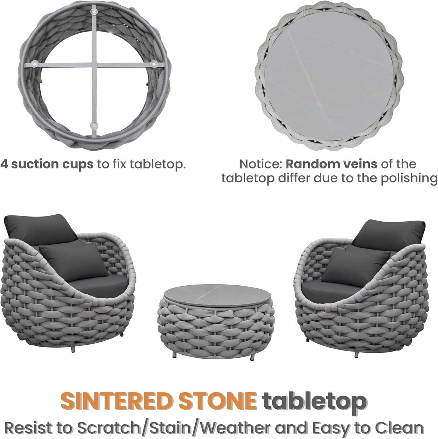 - Easy cleaning and scratch-resistant sintered stone tabletop is fixed by suction cups. Cushions cover replaceable removal and machine washable. Adjustable feet levelers for uneven floor also prevent scratching