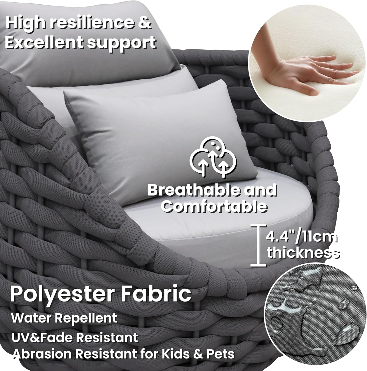 - Filled with 4.3"/11cm thick high-density sponge and cotton, cushions are soft touching and breathable for a refresh comfy patio seating holding its shape. Water repellent and abrasion resistant polyester fabric also fits families with kids and pets