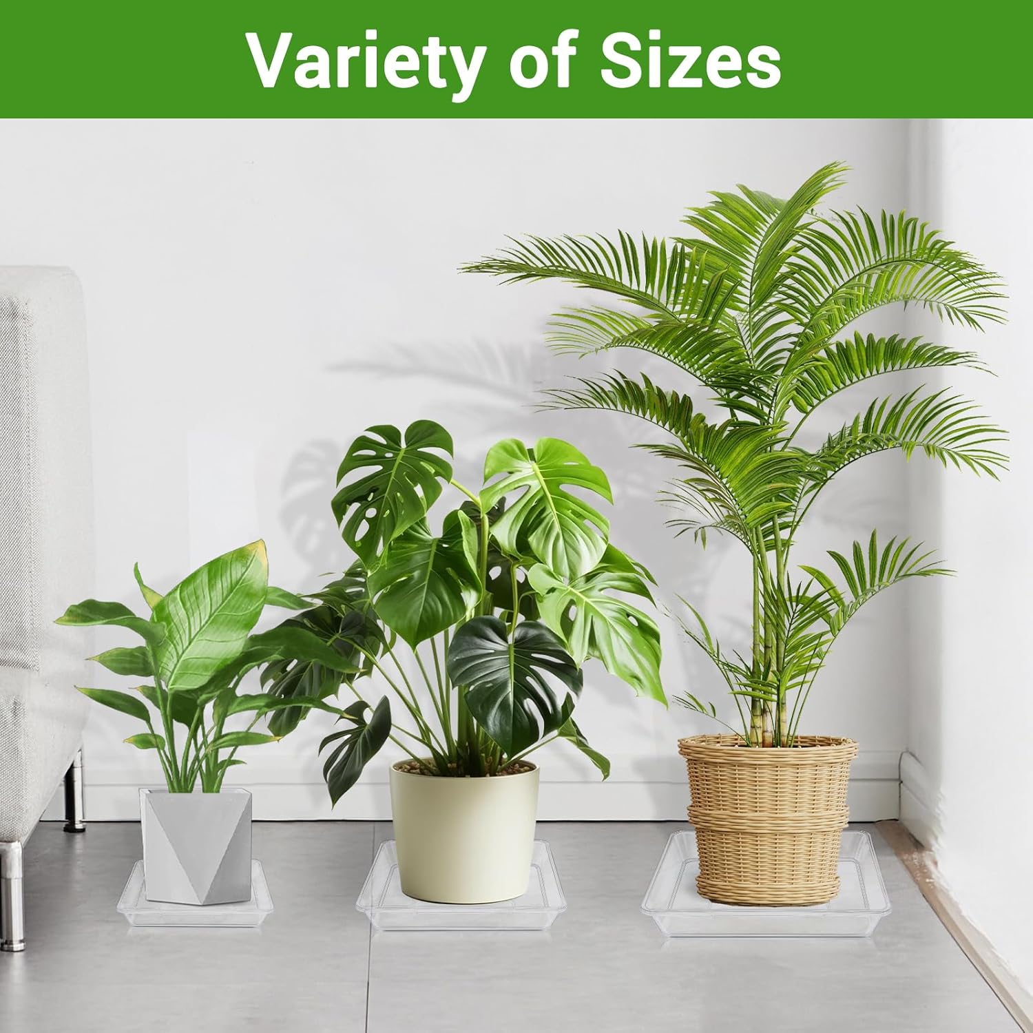 - Variety of Sizes: Our transparent plastic plant saucers come in a variety of sizes, including 6、8、10、11、12、13、14、15、16, and 17 inches, catering to everything from small pots to large plants. These versatile plant trays for pots make it easy to create your ideal plant setup.