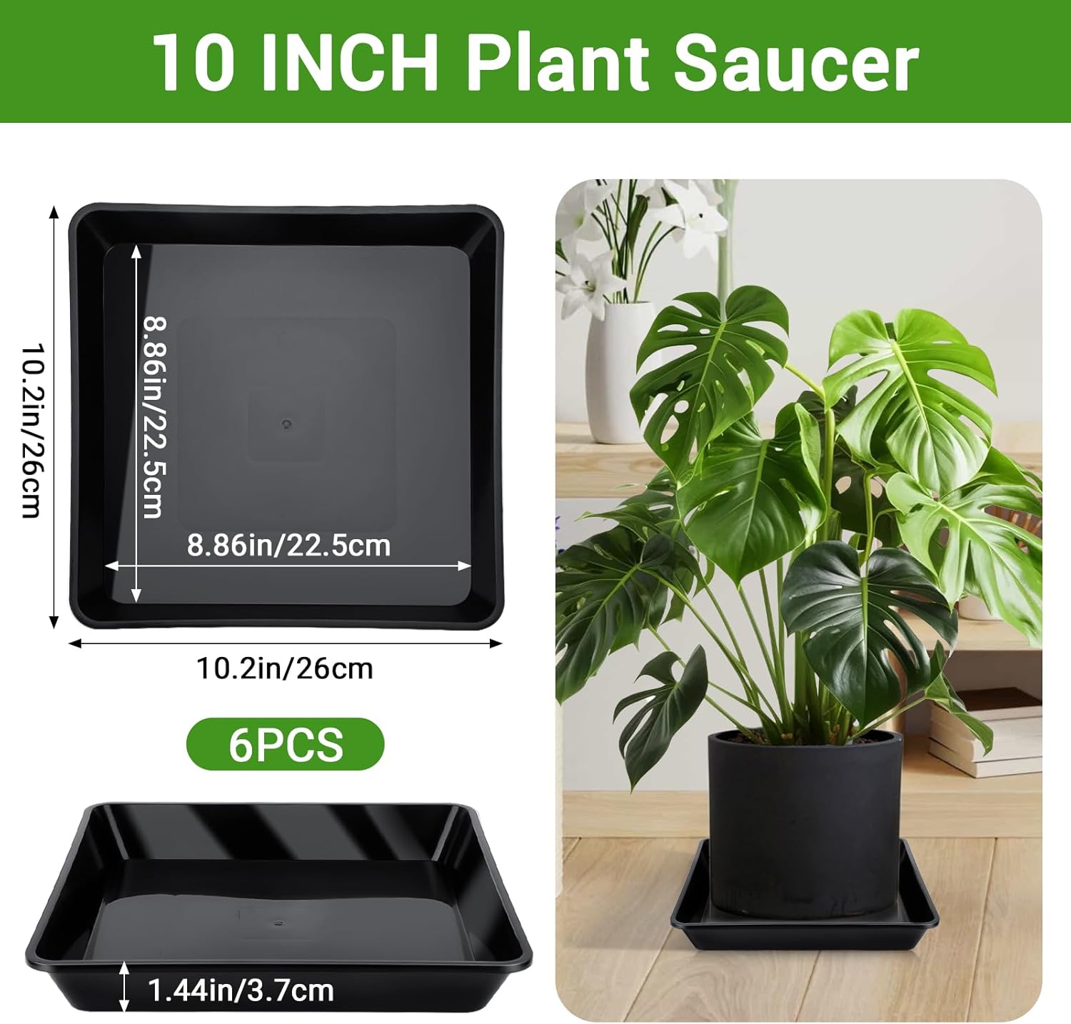 GREANER 6 Packs Square Plant Saucer, Plant Water Dray Tray, Durable Thick Plant Pot Dish for Flower Pot, Plastic Plant Tray to Catch Water for Indoor Outdoor(10 Inch, Black)