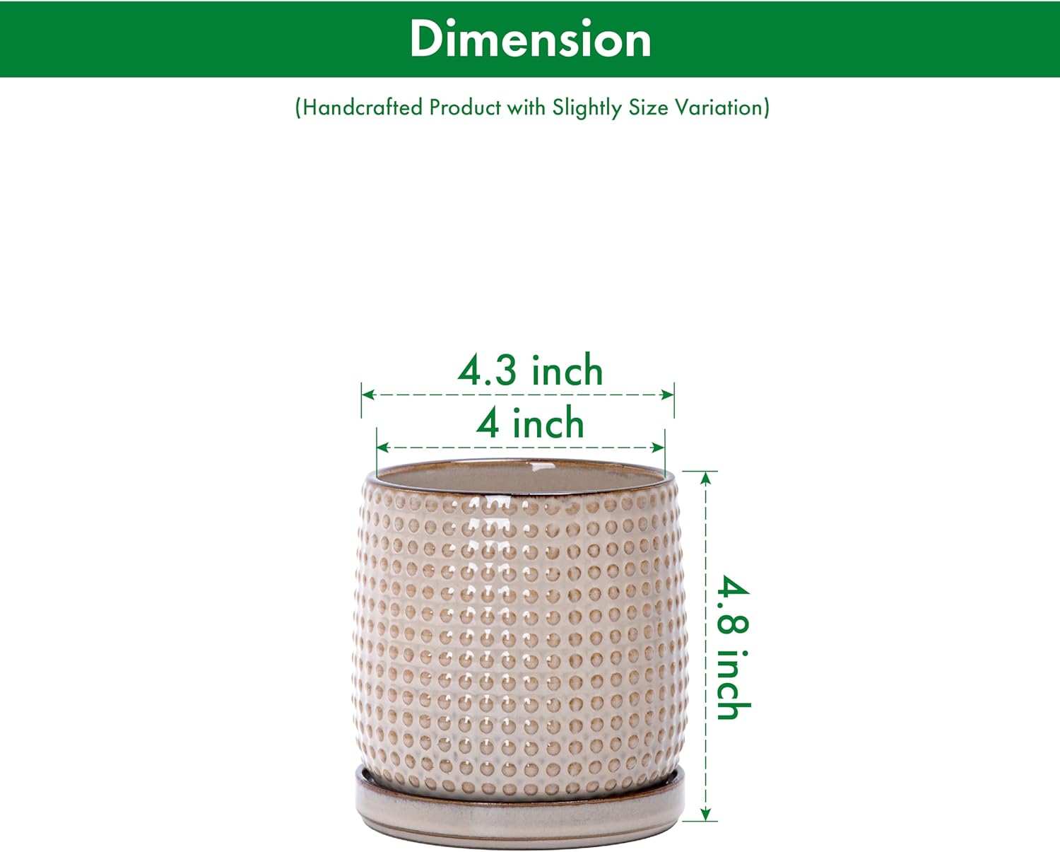 D'vine Dev Set of 2 Ceramic Plants Pots, 4 Inch Beaded Stoneware Flower Pot for Plants with Drainage Hole and Saucer, Light Brown, 27-E-Z-4