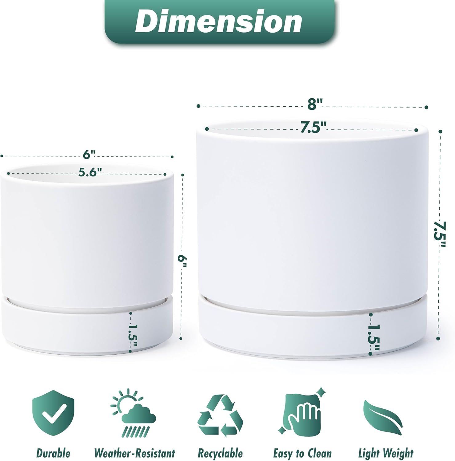 - Two Size Set: Includes a 6-inch pot (6" diameter, 6" height) and a 8-inch pot (8" diameter, 7.5" height). Ideal for a variety of small to medium plants. Please refer to the dimension image for exact measurements.