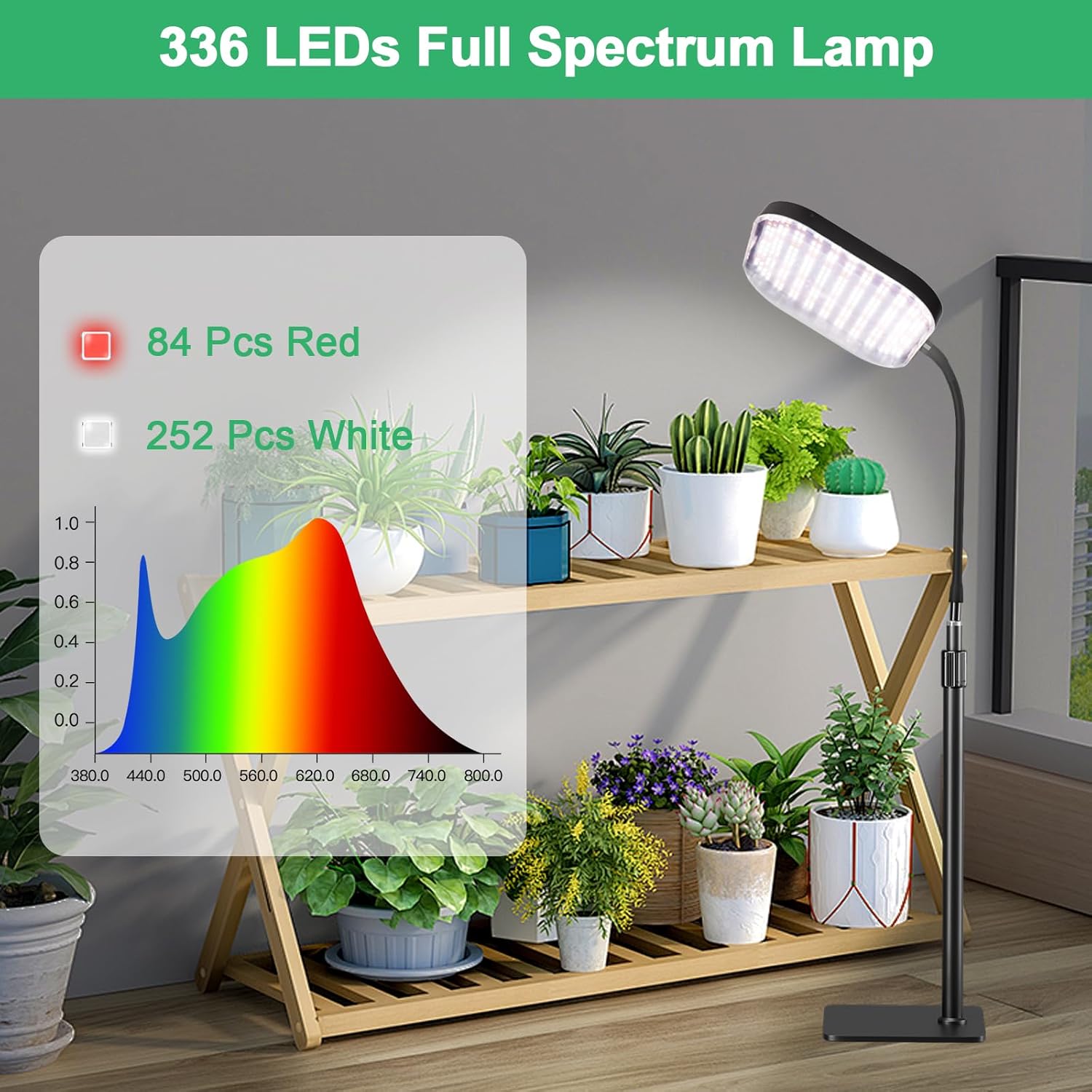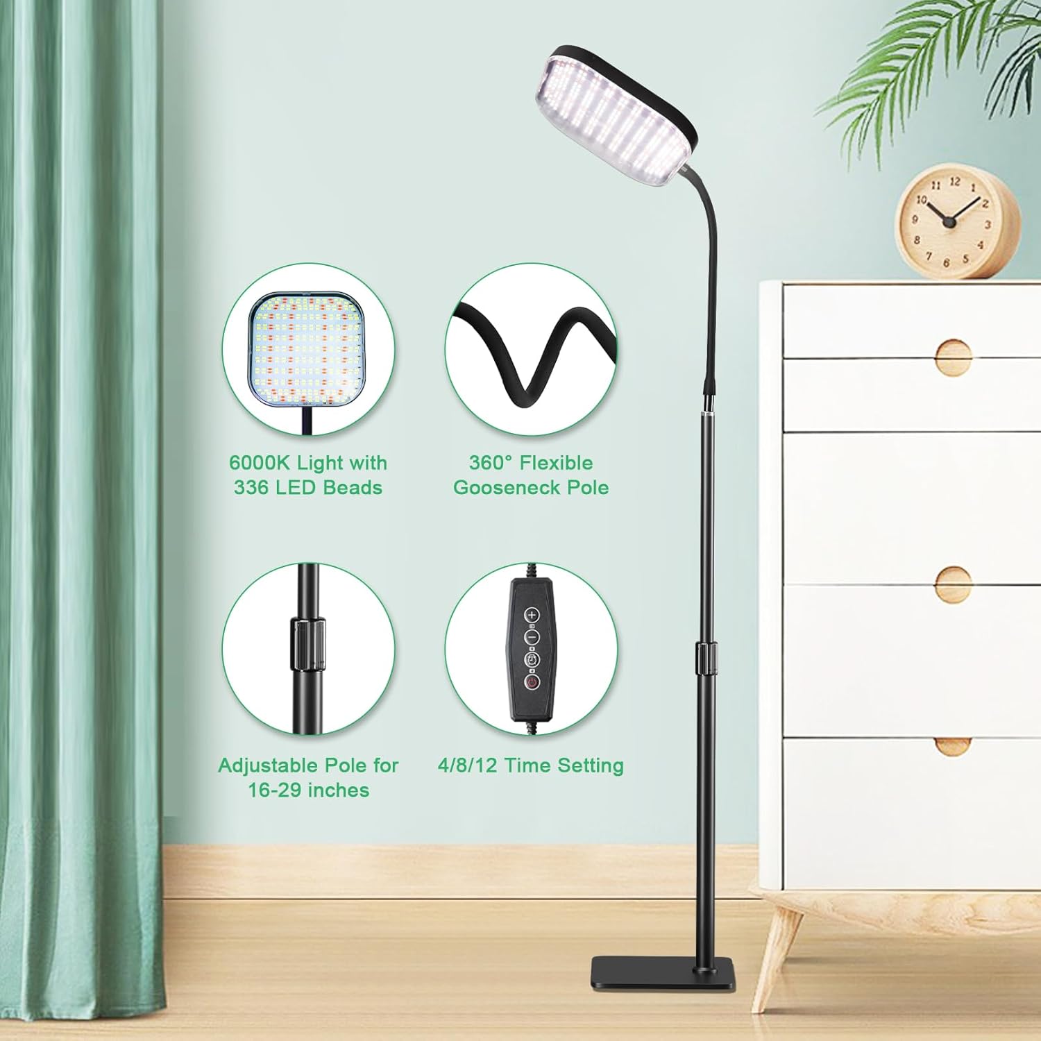 Upgraded Super Bright Grow Lights, 6000K Full Spectrum Standing Floor Plant Light with 336 LEDs & Flexible Gooseneck for Indoor Large Plants, Dimmable & Timer 4/8/12Hrs, 12V 3A High Power Output