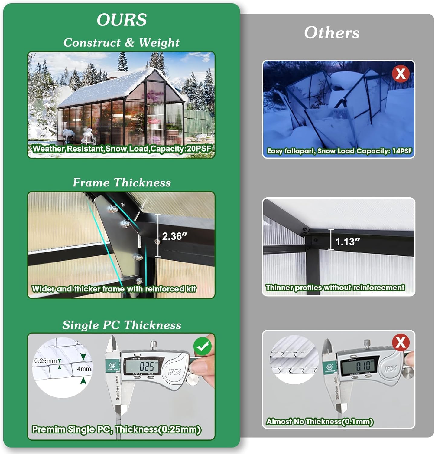 - Sturdy Frame: Our greenhouse kit boasts a robust rust-resistant aluminum frame designed to withstand various weather conditions. Introducing patented technology, Easy assembly, saving you 50% of your time. Gone are the days of tedious setups. With a simple push and locking screw, our Quick Connect ensures a reliable, secure, and swift link-up. It can also support snow loads of up to 20PSF.