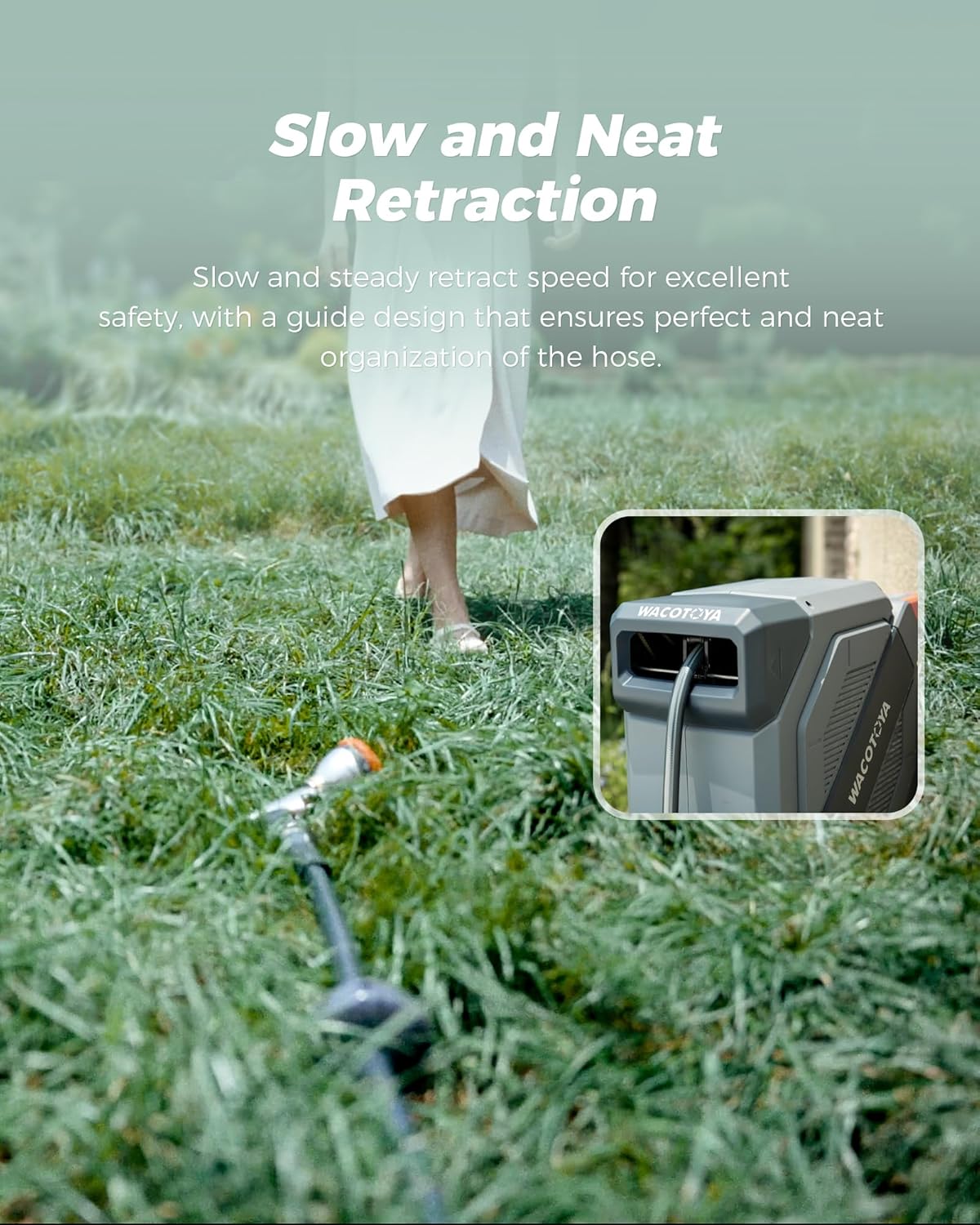 - Born for Irrigation: WACOTOYA engineers designed a gentle water pressure system for the auto rewind water hose reel to protect plants and ensure efficient irrigation with high flow rates
