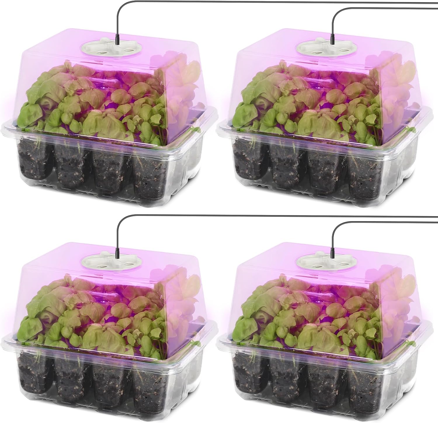 MIXC Seed Starter Kit with Grow Light, Elevated Seedling Tray Kit with Adjustable Humidity Dome and Clear Cell Tray, 12 Full Spectrum Led Beads for Seed Starting Greenhouse, 4 Pack, Transparent