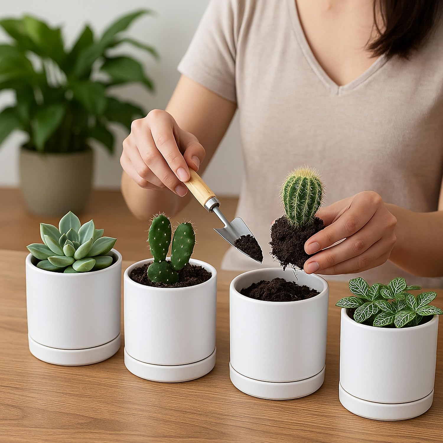 D'vine Dev Set of 4 Small Ceramic Plant Pots, 3.5 Inch Succulent Planter Pot for Plants with Drainage Hole and Saucer, White, 94-X-A-1