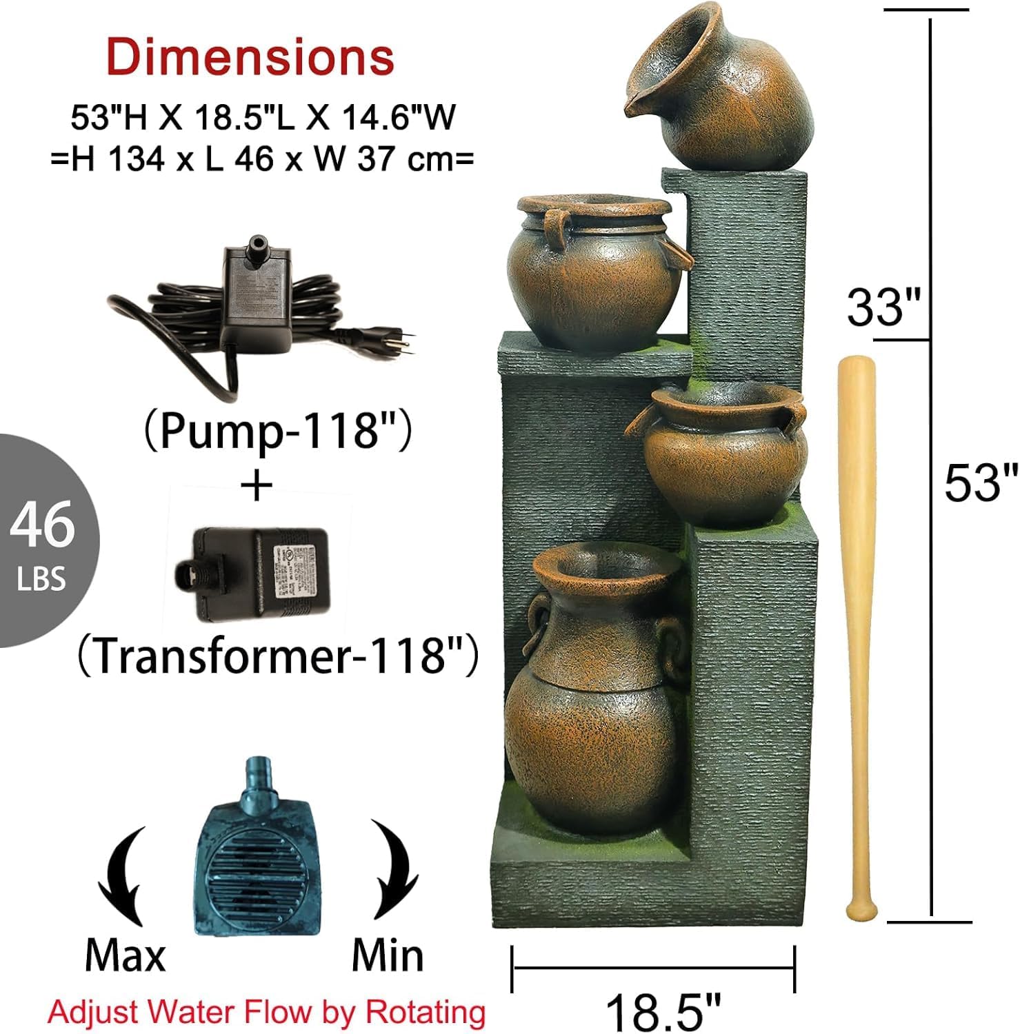 - Easy Installation and Maintenance: Setting up this contemporary fountain is a breeze—simply connect the water pump and transformer, and you're ready to go. Measuring 18.5"L X 14.6"W X 53"H, it fits perfectly into most outside/inside spaces. The package includes the fountain (46 lbs), pump, transformer, and instructions. With its 110V~120V 60Hz US plug and 6ft power cord, it offers both convenience and ease of use.