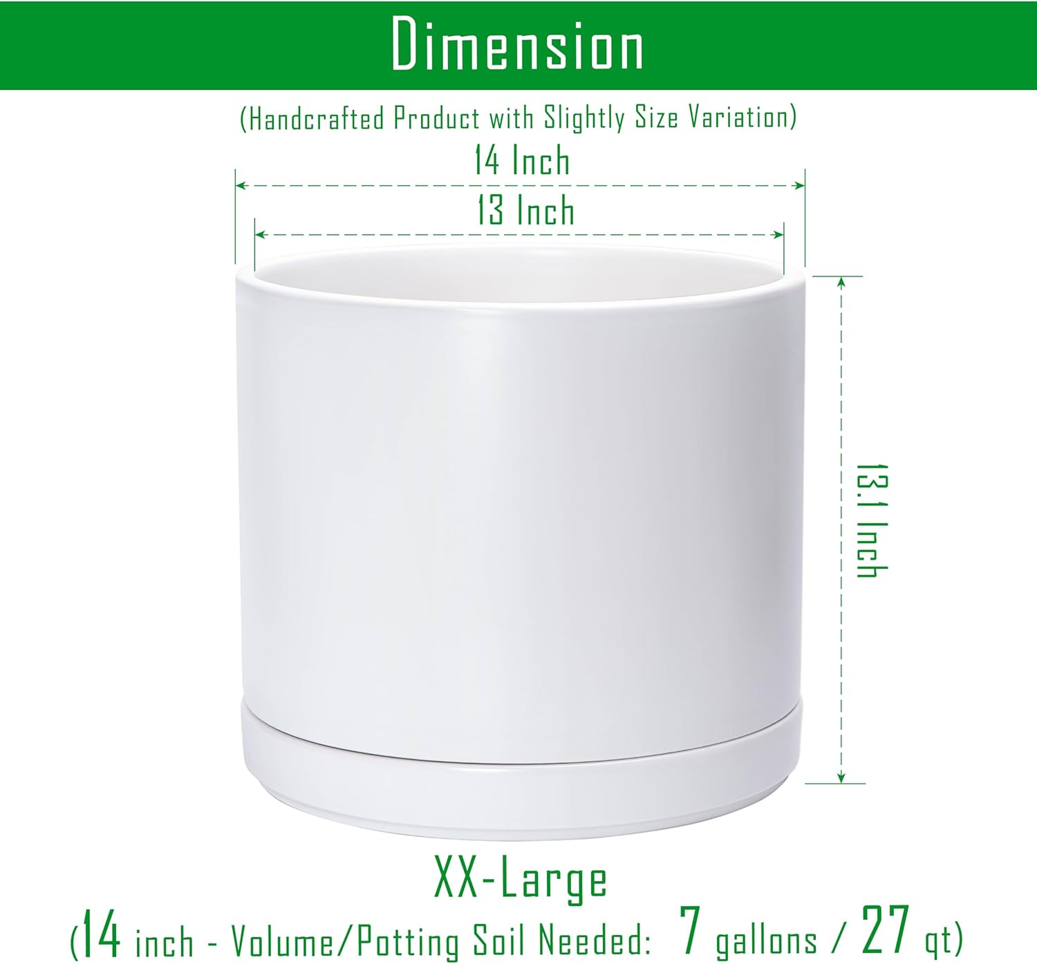 - XXLarge 14 Inch Planter Pot: 14" Diameter x 13.1" H, white color.
